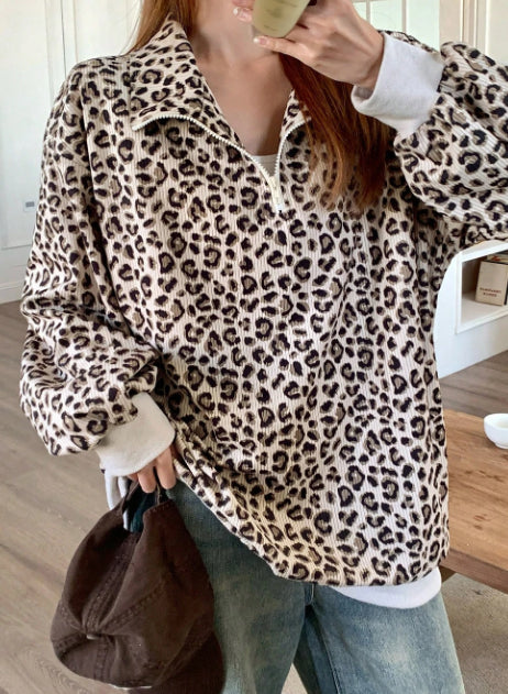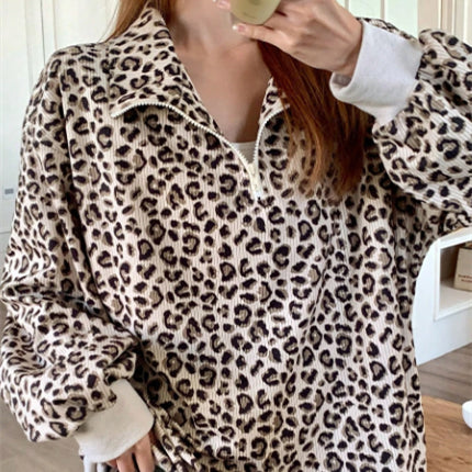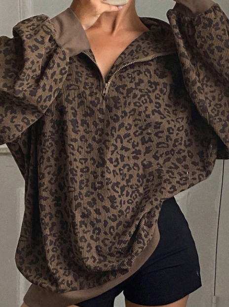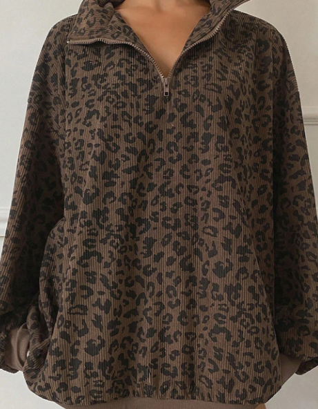 سويت شيرت مخملي بيج بنقشة جلد النمر وسحاب ربعي