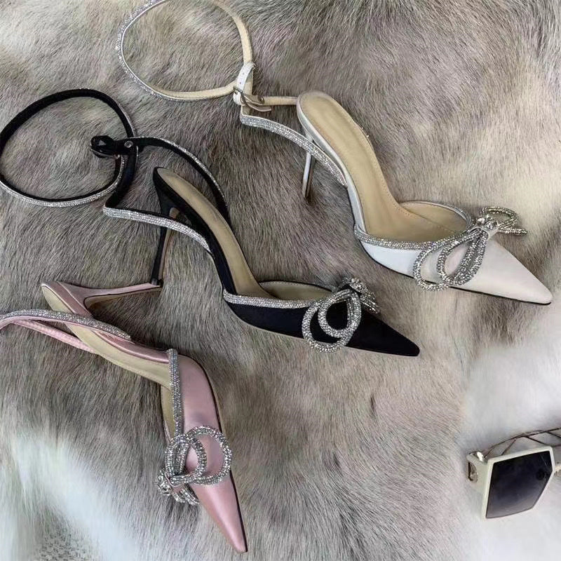 صندل أنيق بكعب عالٍ مزين بفيونكة وأحجار الراين الكريستالية، مصنوع من الساتان، مناسب للحفلات والمناسبات الرسمية.