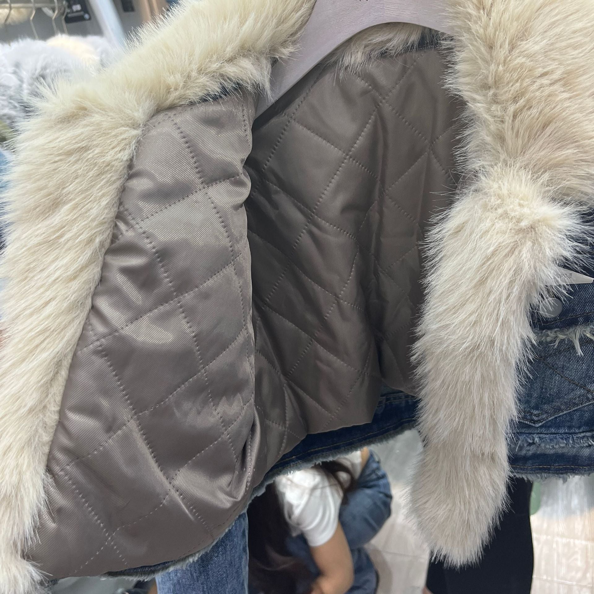 معطف قصير من الدنيم مبطن بفرو الثعلب، صديق للبيئة، بتصميم يجمع بين قطع الدنيم المتداخلة، مع مراعاة البيئة.