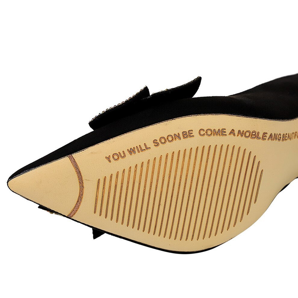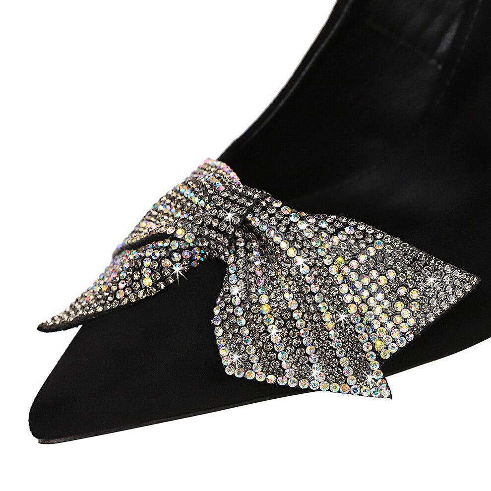 حذاء أنيق وجذاب بكعب عالٍ رفيع من جلد الغزال مزين بفيونكة مرصعة بأحجار الراين