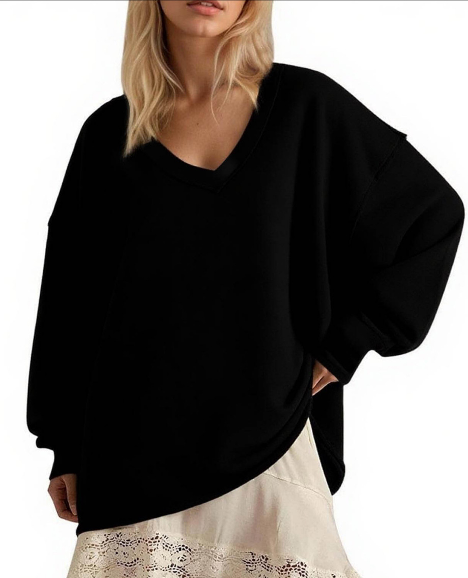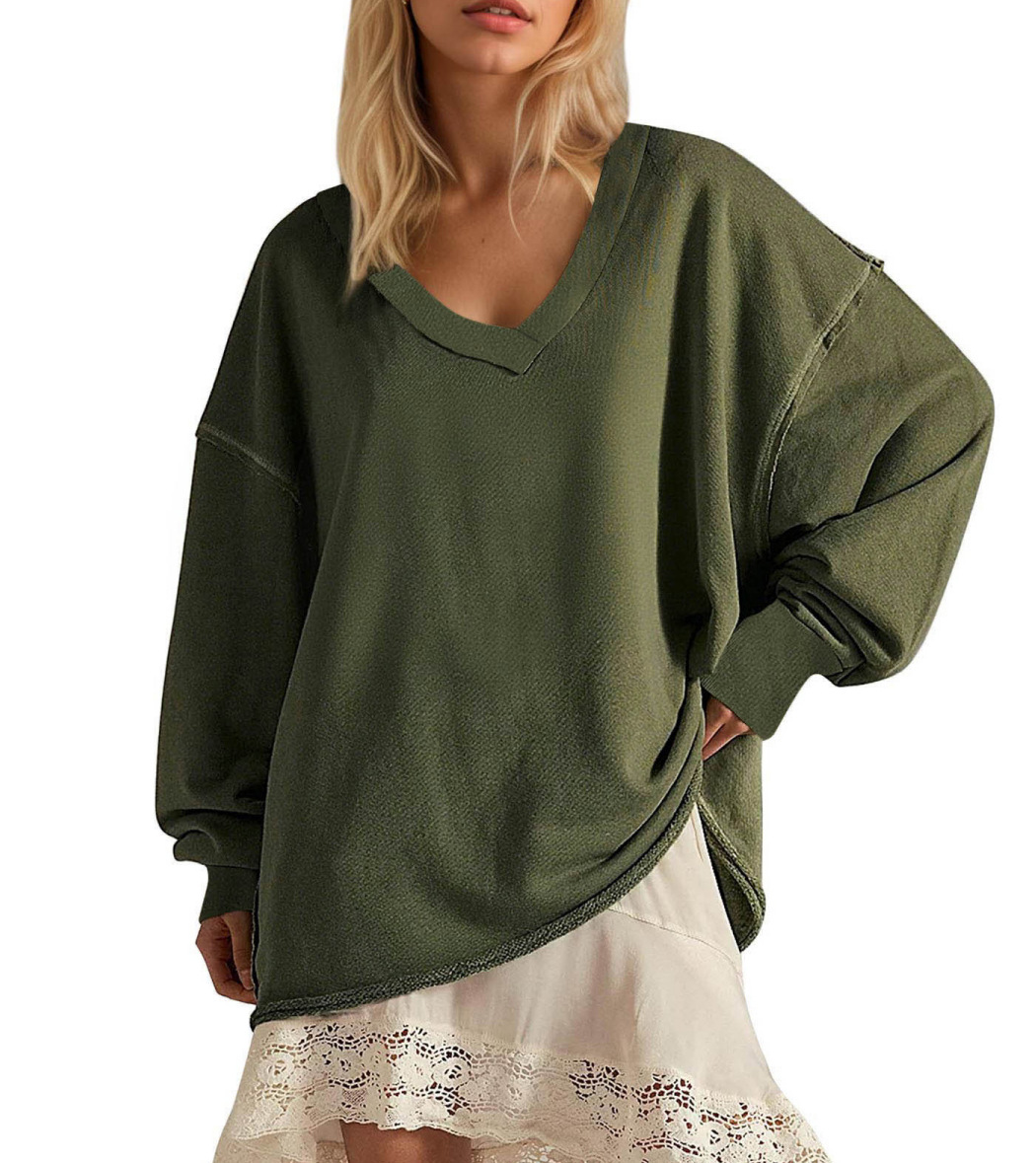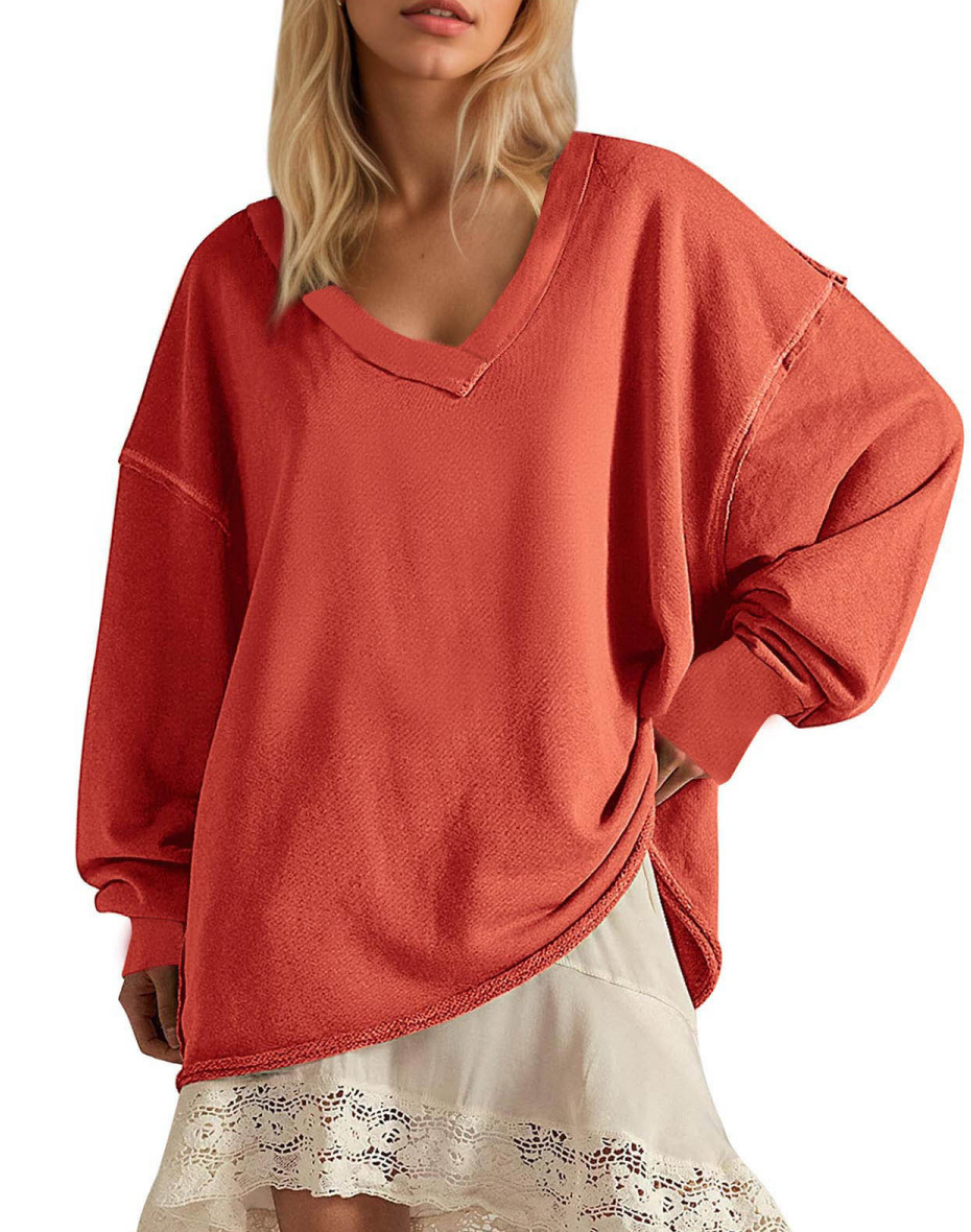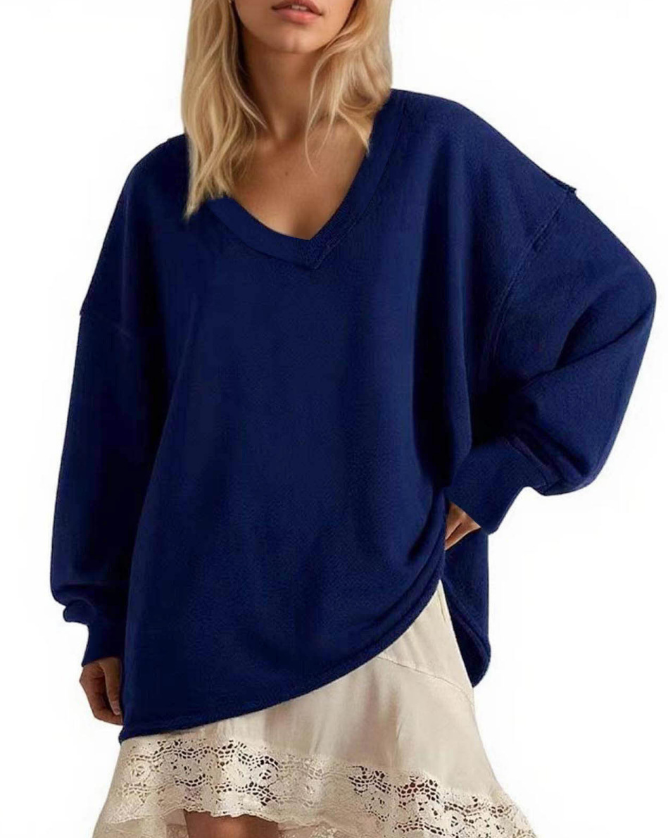 بلوزة جديدة بلون موحد، بياقة على شكل حرف V، فضفاضة، بأكمام طويلة للنساء