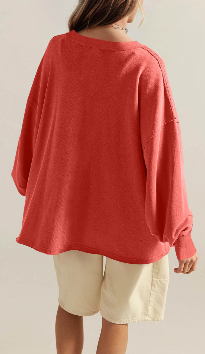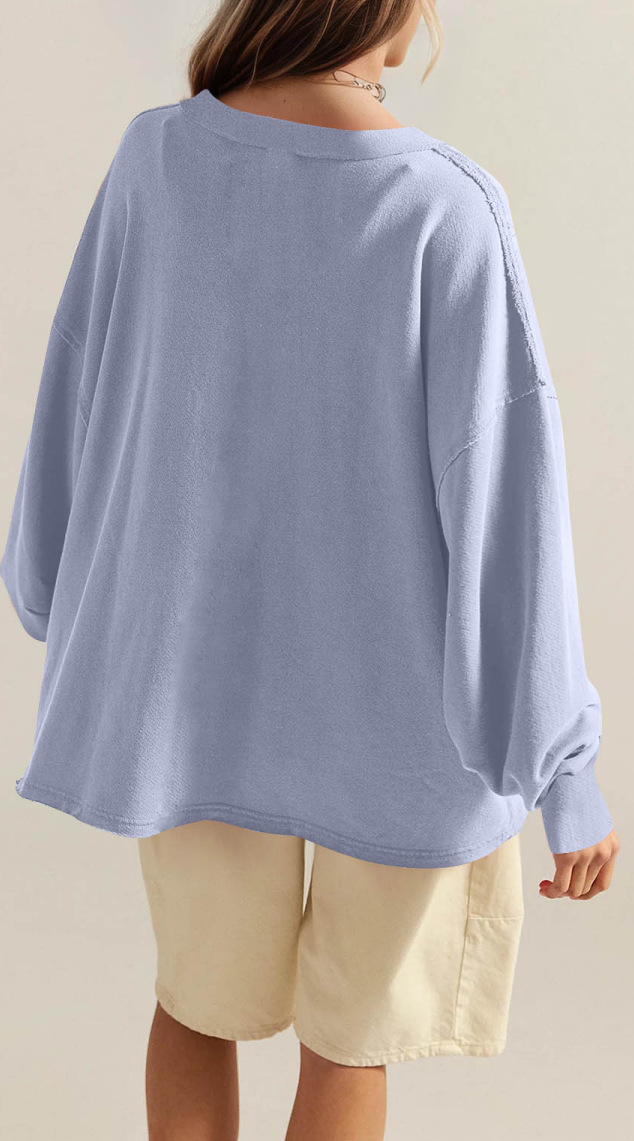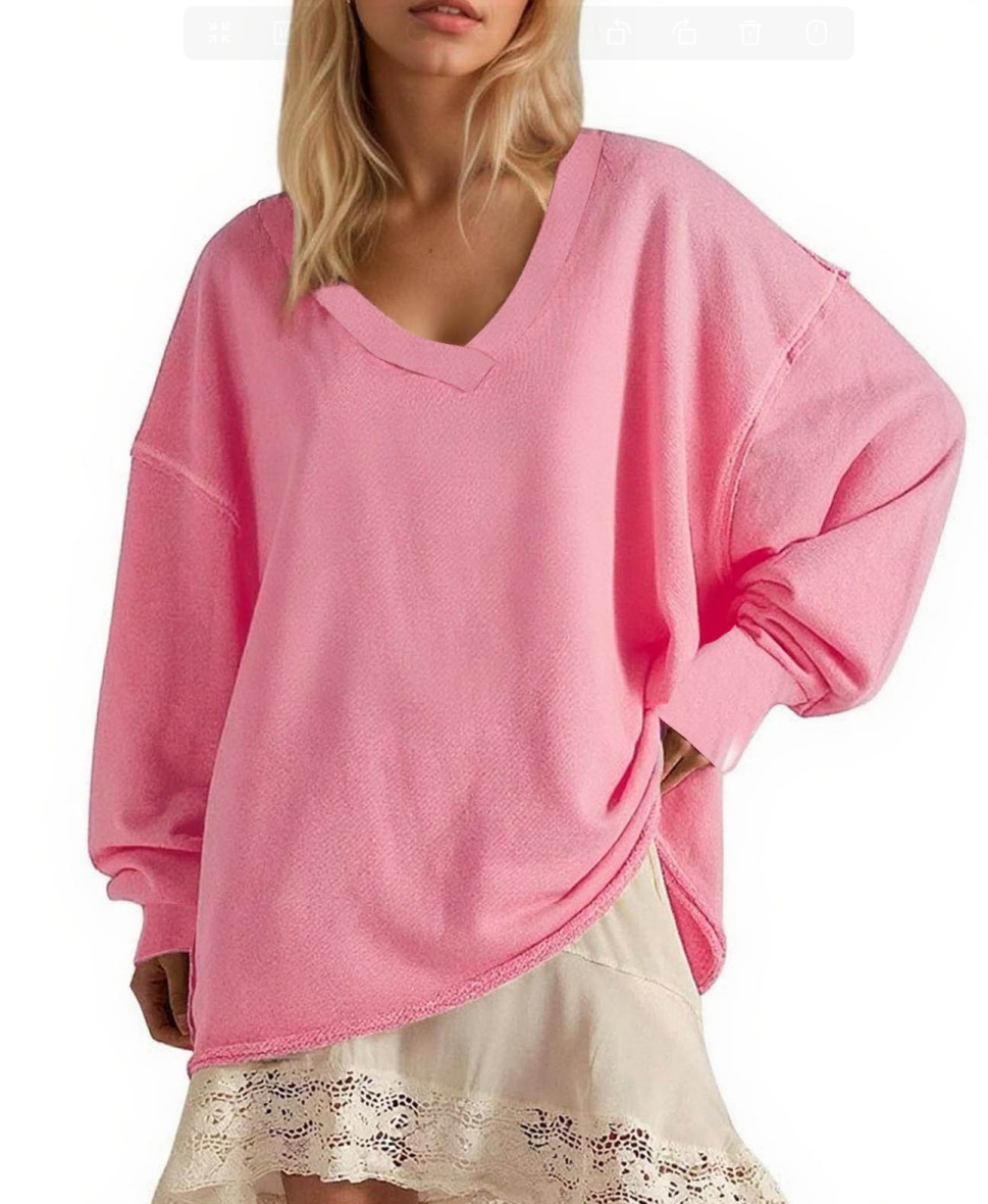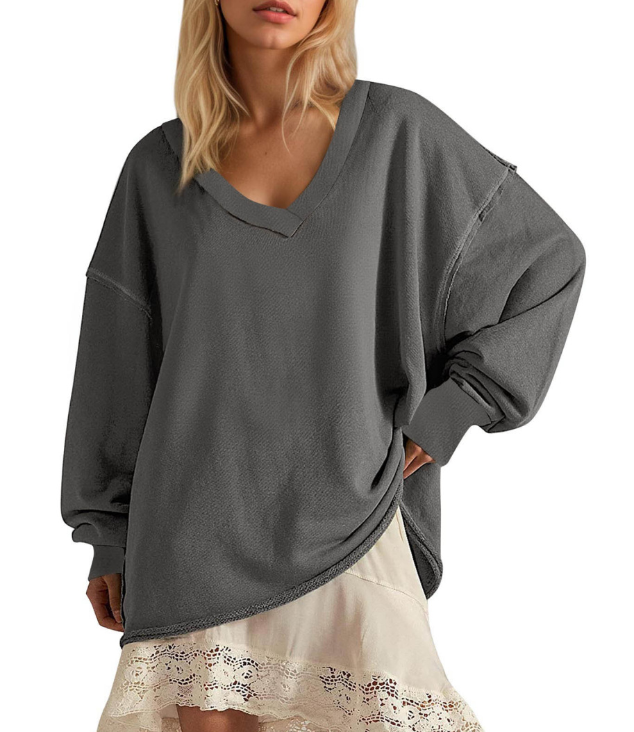 بلوزة جديدة بلون موحد، بياقة على شكل حرف V، فضفاضة، بأكمام طويلة للنساء
