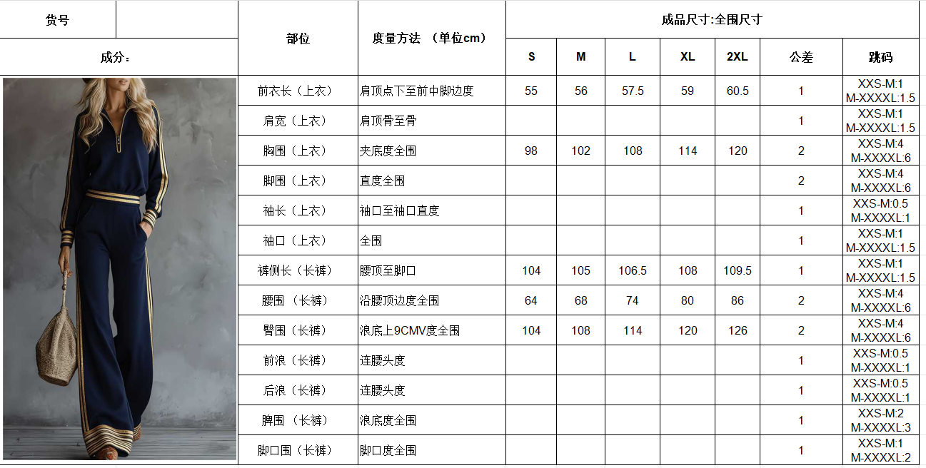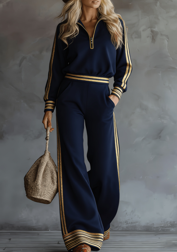 التصميم: بلوزة بياقة عالية وسحاب نصفي + بنطال واسع الساقين بخصر عالٍ (يجعلك تبدين أطول ويخفي اللحم)، مع خطوط ذهبية الحواف على الجانبين/الأساور كزخرفة مميزة؛