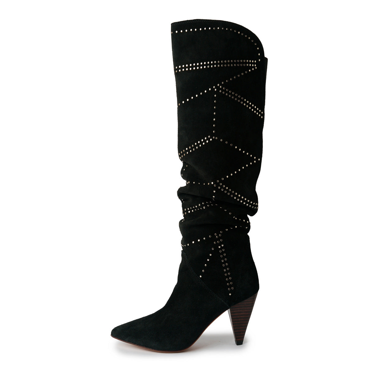 حذاء بوت عالي الساق بكعب مخروطي مدبب مزين بمسامير
