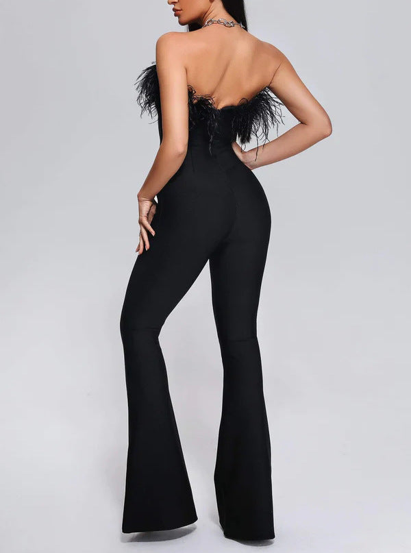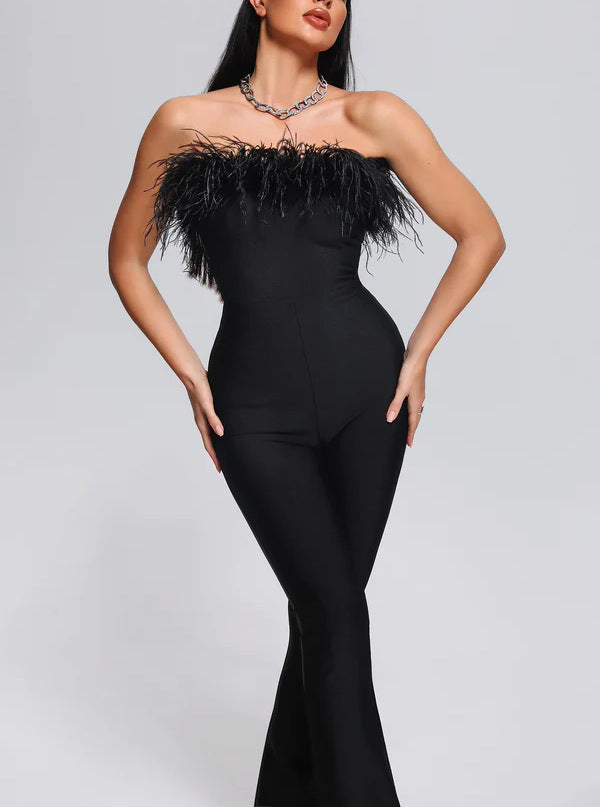 جمبسوت طويل مستقيم مثير بدون أكمام مزين بفيونكة من الريش، يبرز قوامك بشكل أنيق