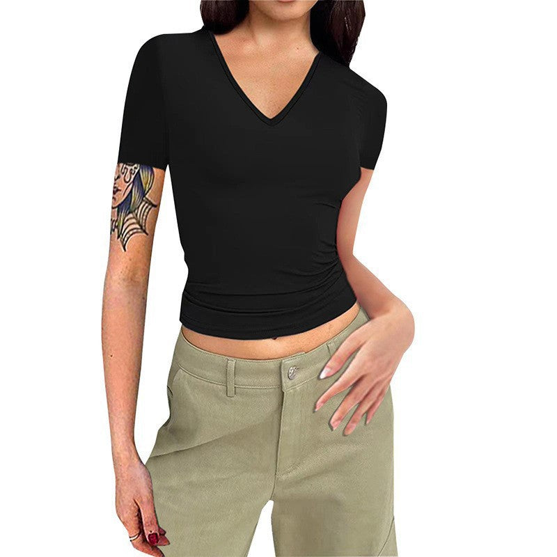 بلوزة قصيرة الأكمام بياقة على شكل حرف V وقصة ضيقة بلون موحد