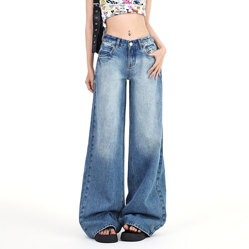 بنطلون جينز نسائي صيفي بتصميم أمريكي كلاسيكي، بخصر منخفض وأرجل واسعة