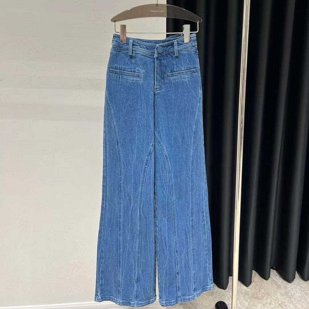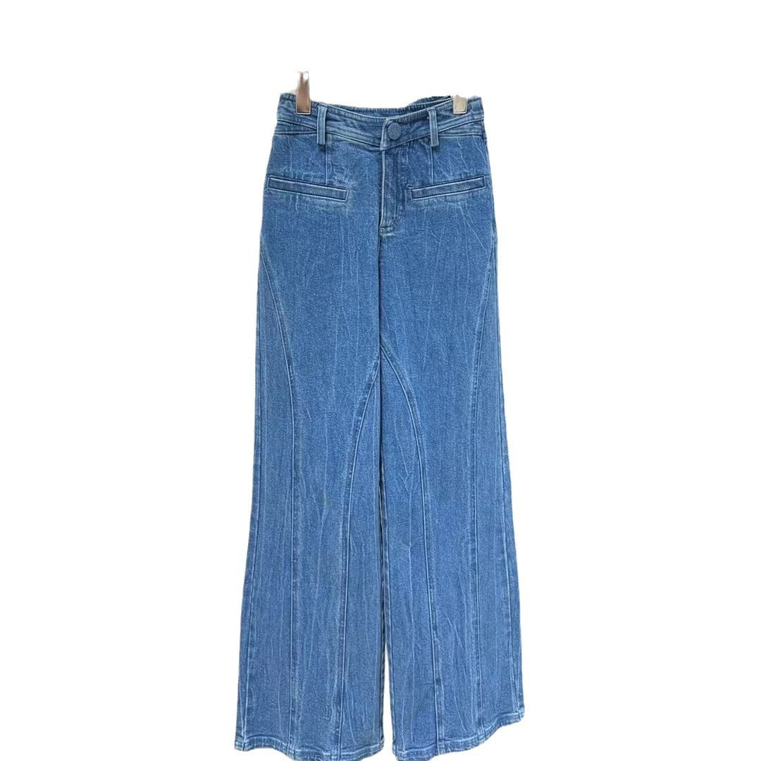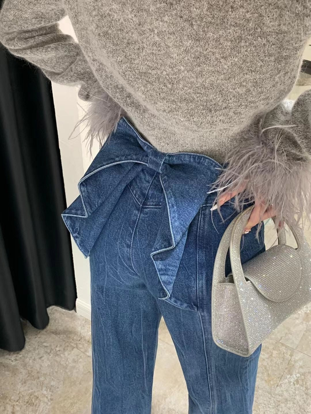 بنطلون جينز نسائي بخصر عالٍ مزين بفيونكة، بقصة مستقيمة وأرجل واسعة