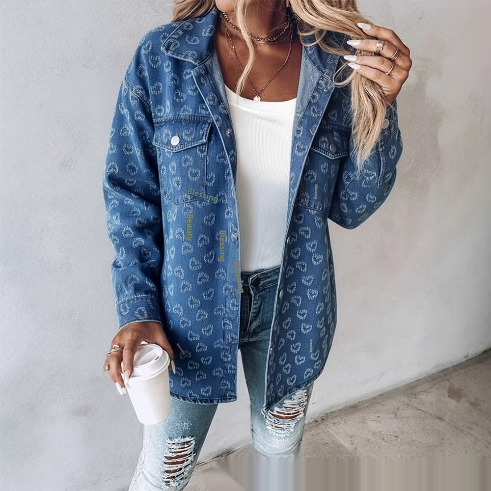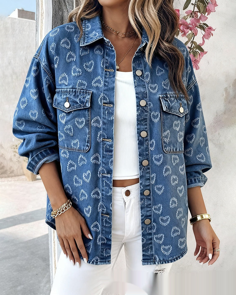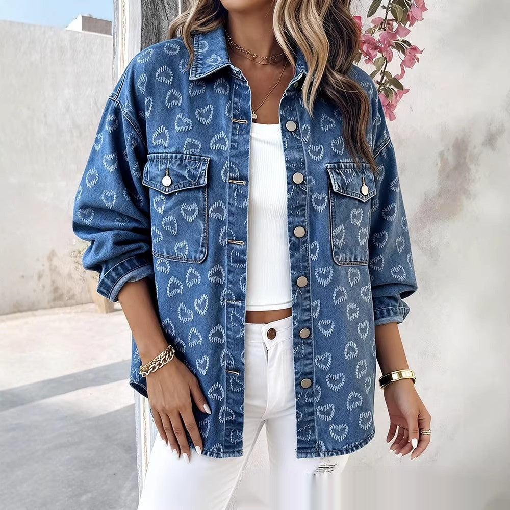 جاكيت جينز نسائي كلاسيكي مطبوع عليه قلوب جاكار