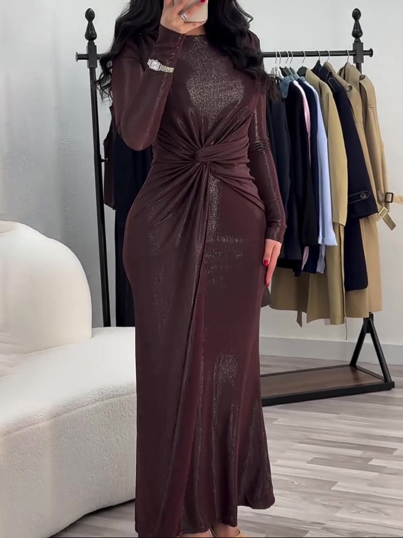 Robe longue musulmane métallisée avec détail torsadé sur le devant et manches longues