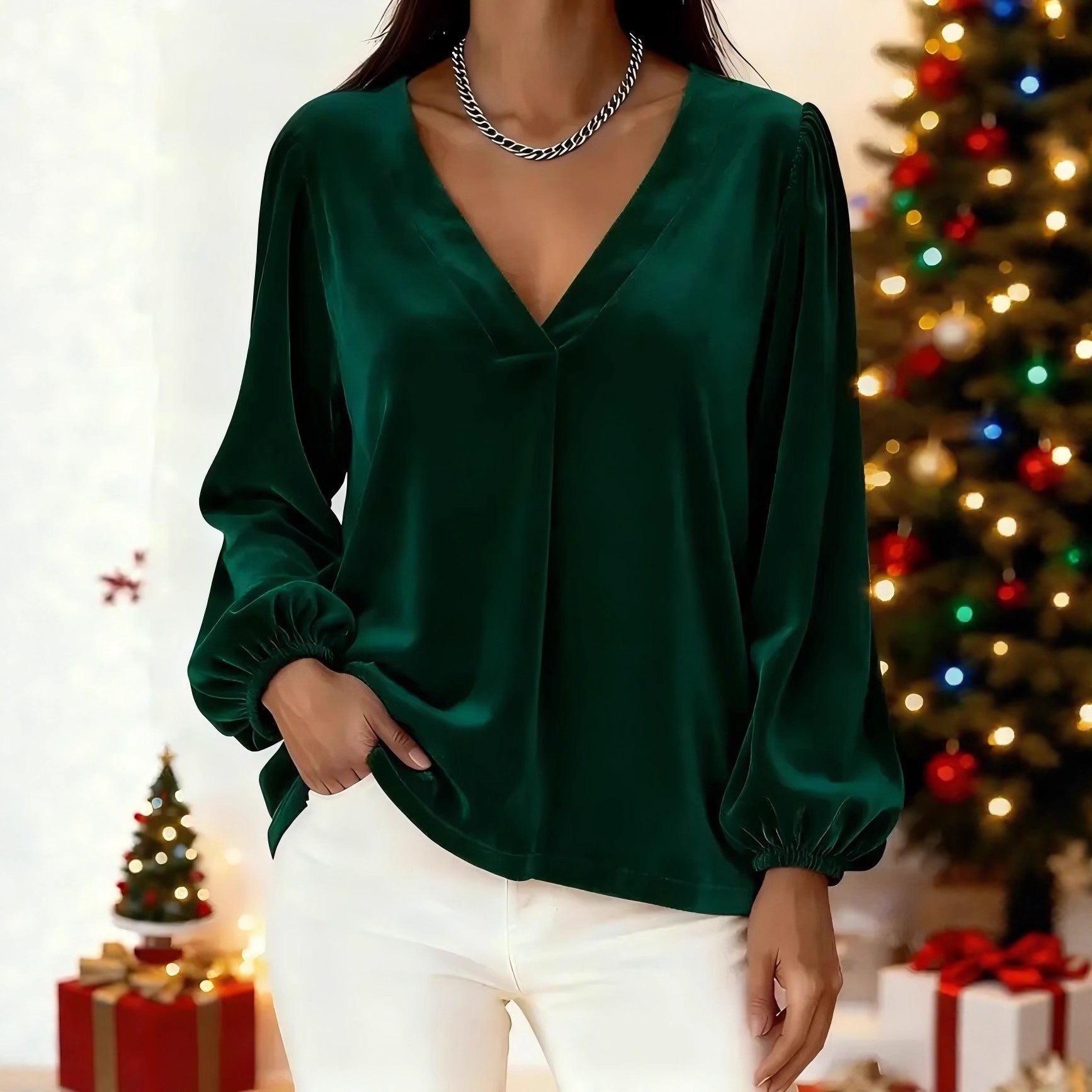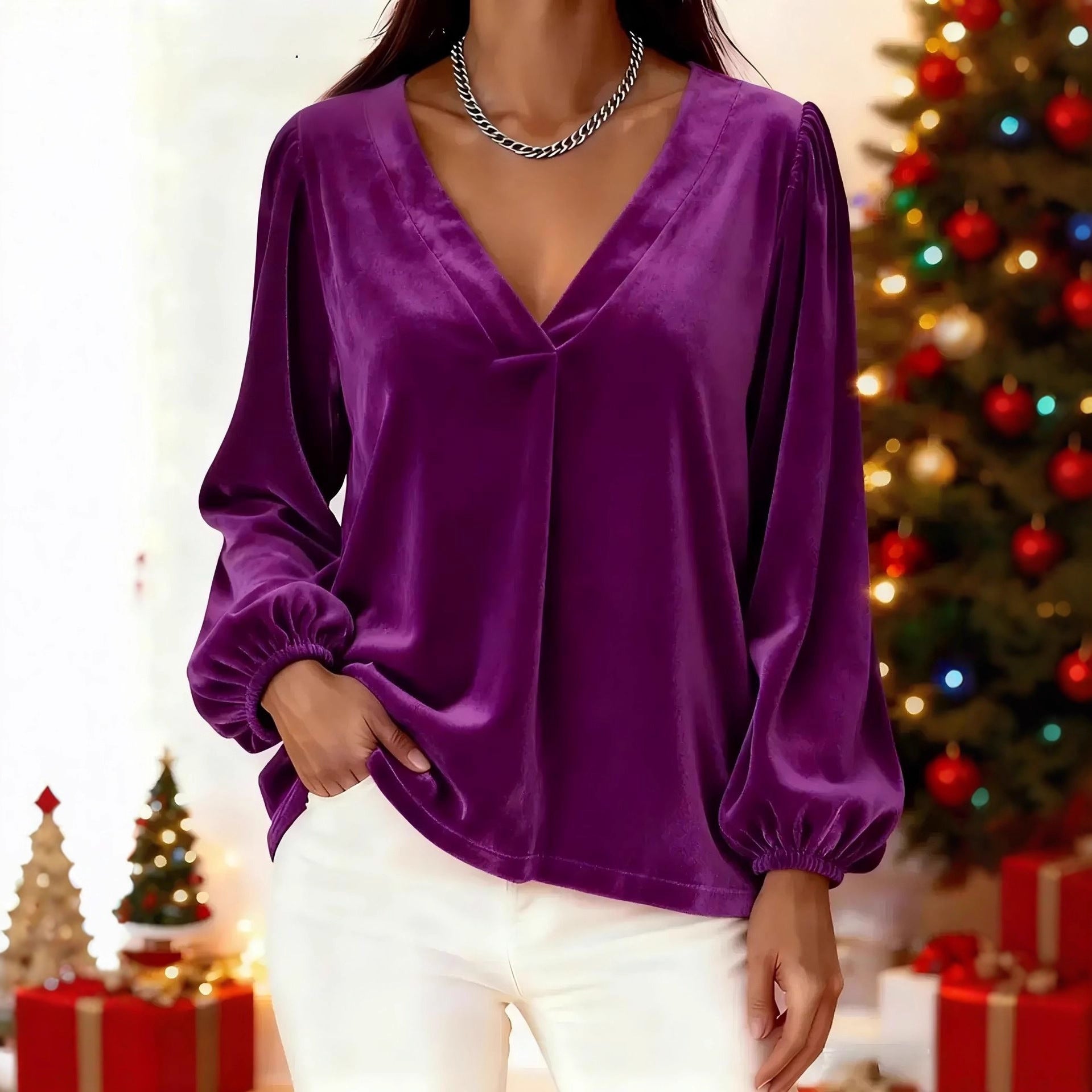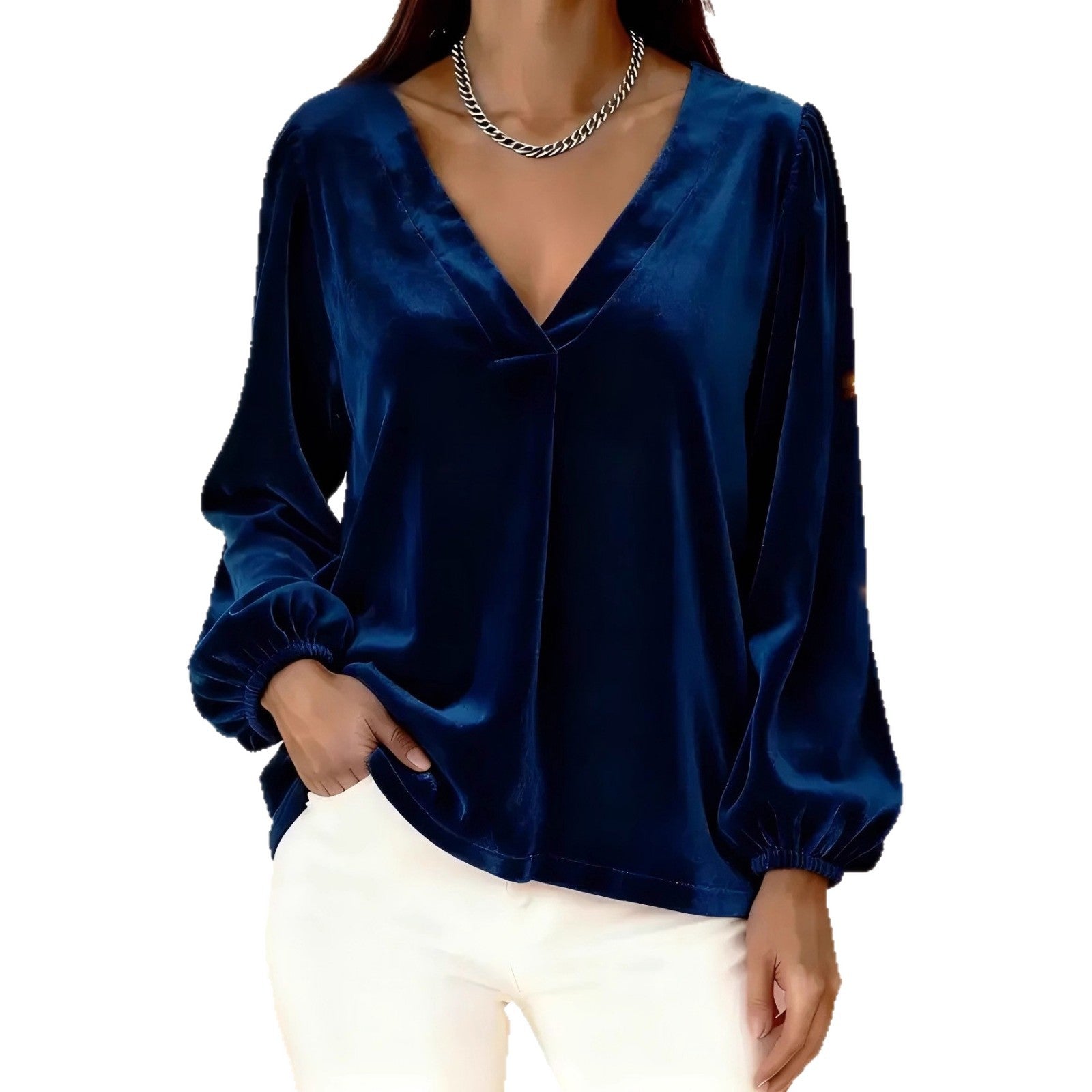 Haut pour femme en velours à col en V, élégant et luxueux, à manches lanternes