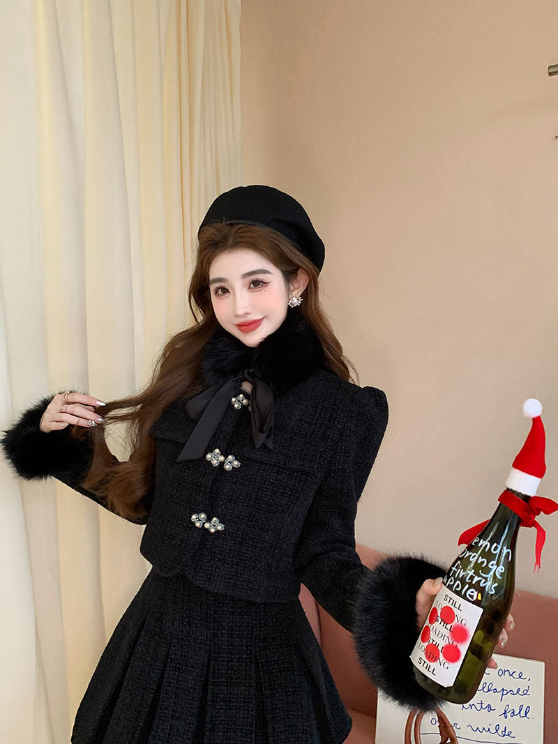Ensemble jupe plissée taille haute pour femme, composé d'un haut à col en fourrure amovible et d'un tailleur.