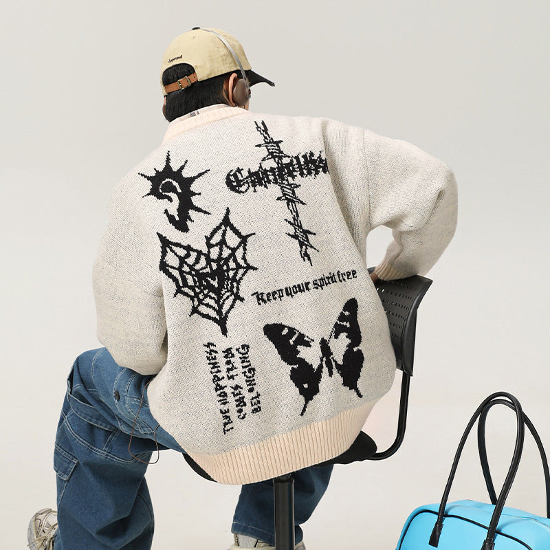 American Retro Hand-painted Jacquard Round Neck Sweater