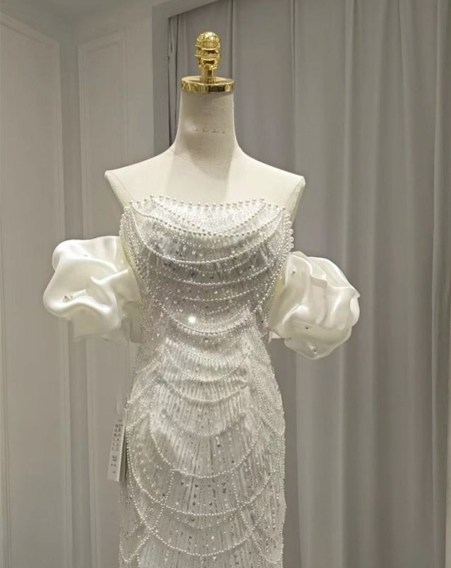 Colour: Off shoulder sleeves+bow tie, off shoulder neckline without pearls