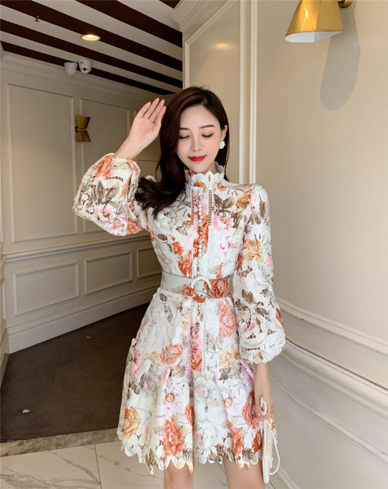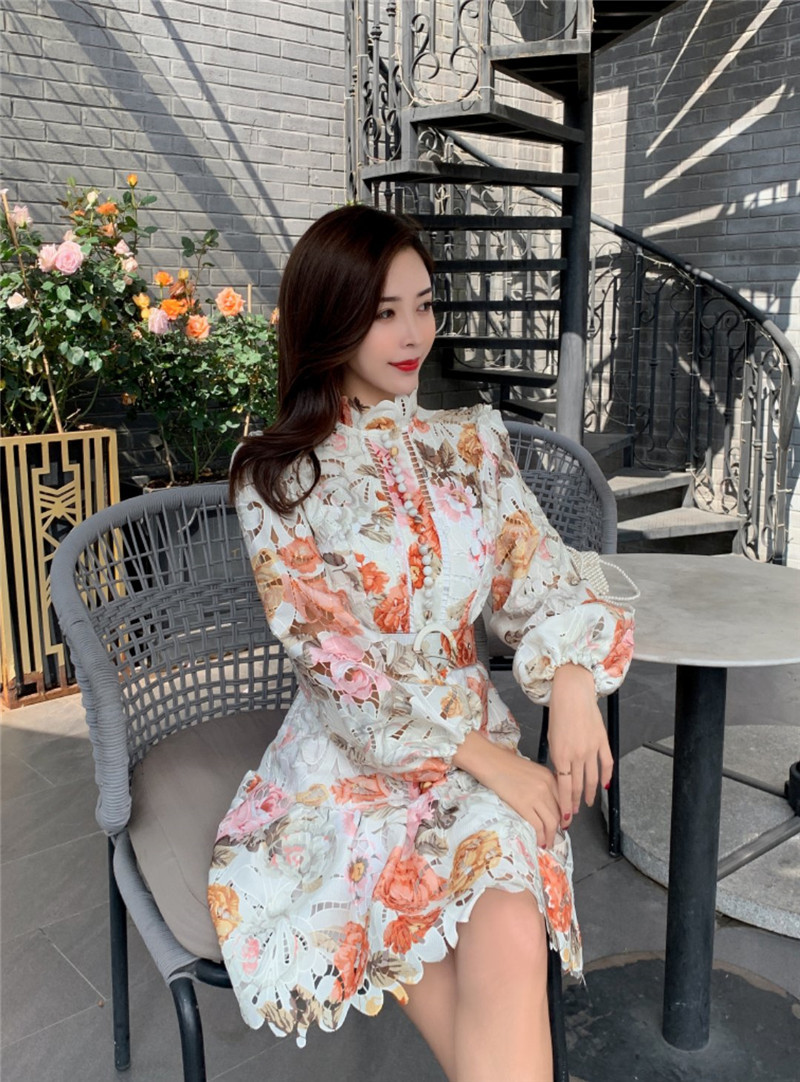 Color Floral Hollow Stand Collar Dress