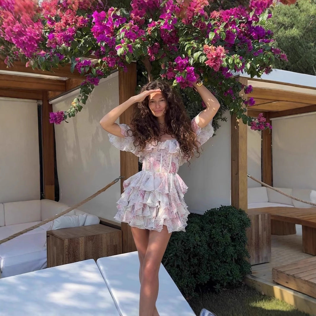 Color Printed Off-the-neck Stacked Ruffled Waist Dress