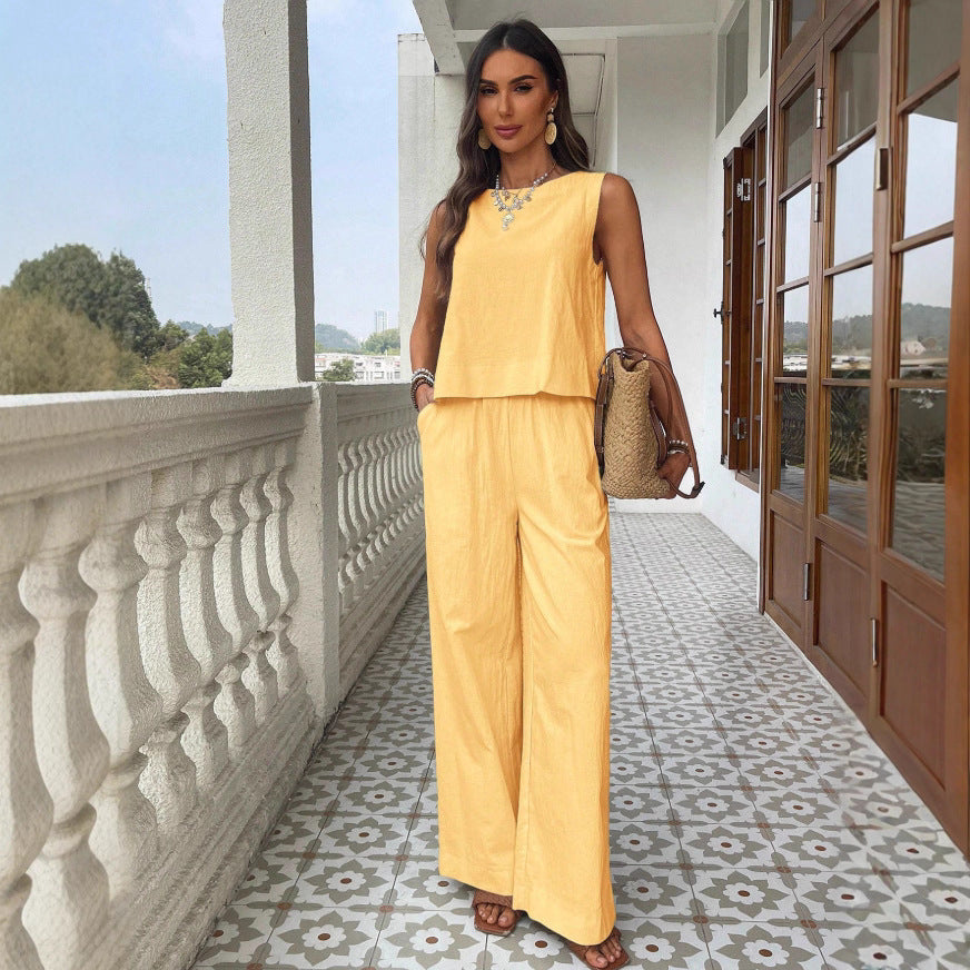 Cotton-Linen Loose Tank Top And High-Waisted Loose Straight-Leg Pants Casual Set