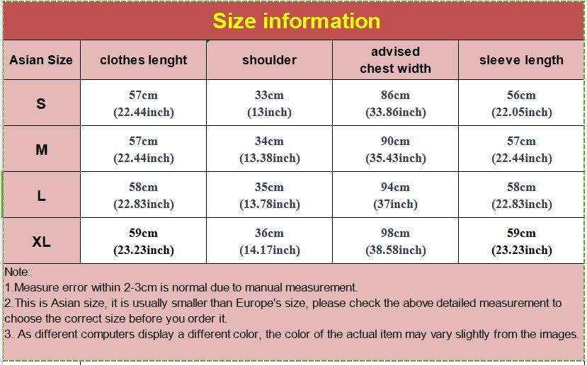 1. Asian sizes are 1 to 2 sizes smaller than European and American people. Choose the larger size if your size between two sizes. Please allow 2-3cm differences due to manual measurement.