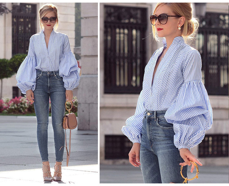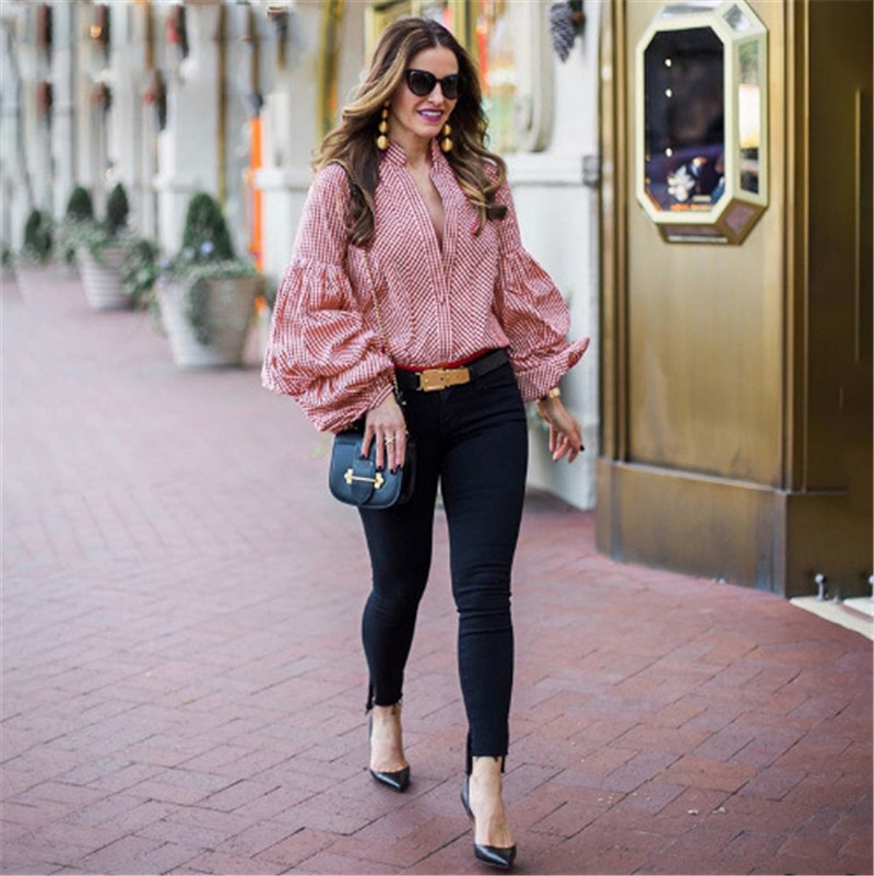 European and American Fashion Plaid V-neck Button Puff Sleeve Shirt