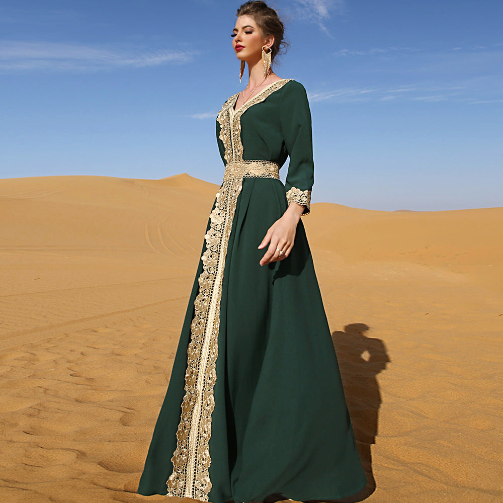 Fashion Arabian Women's Dark Green Embroidered Lace Dress