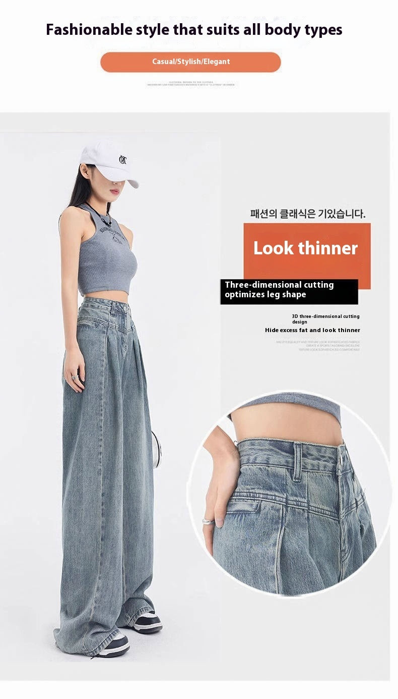 Fashionable Pleated Design Loose All-matching Straight Wide Leg Jeans For Women