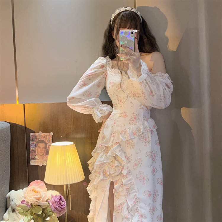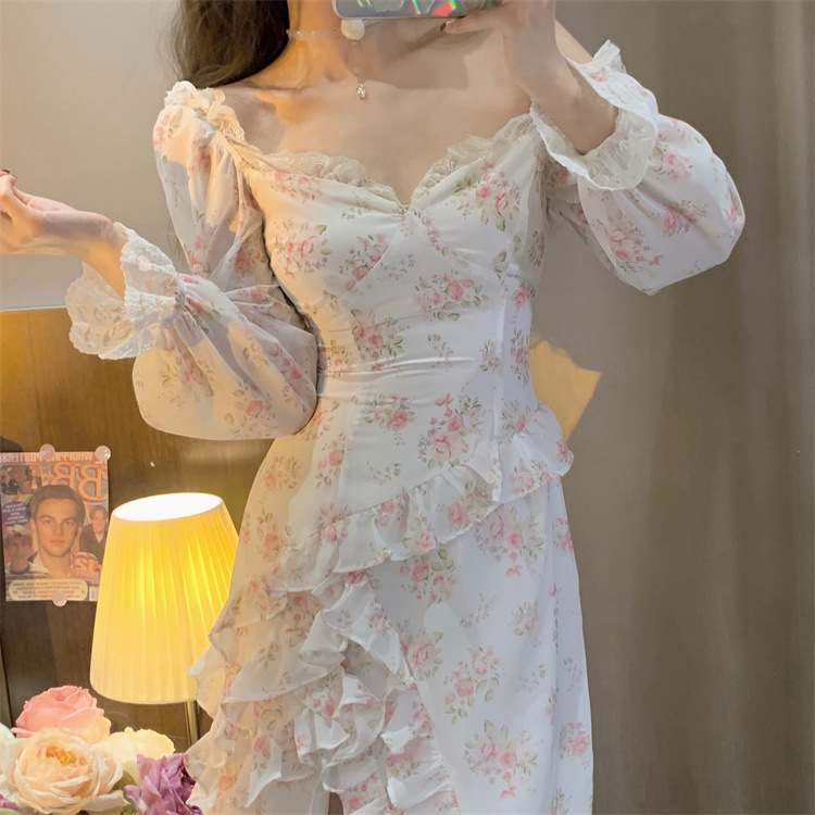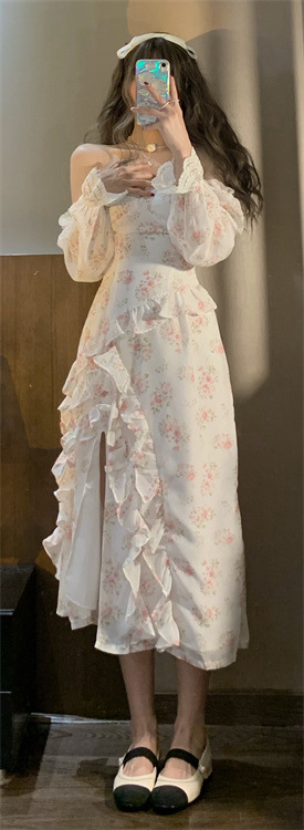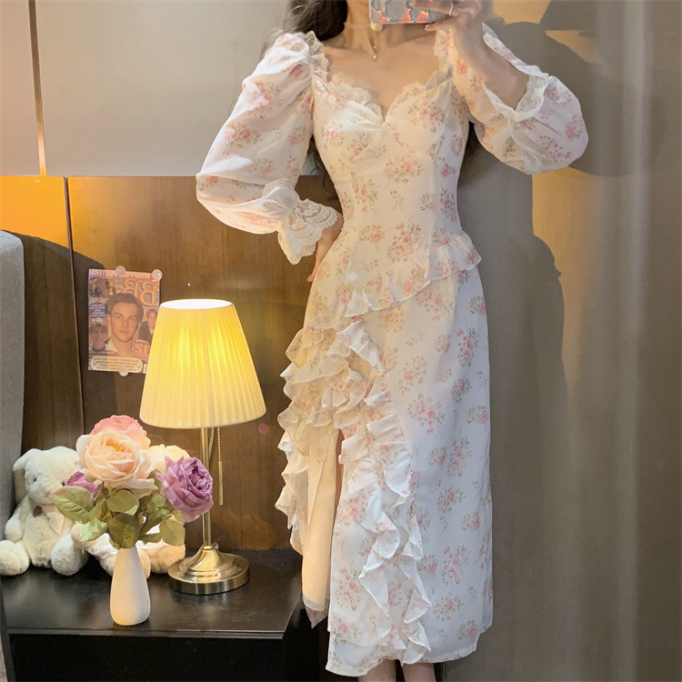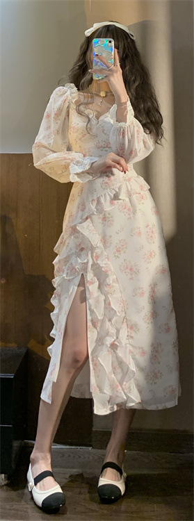 French Chiffon Floral Slit Dress High Waist Slim Ruffle