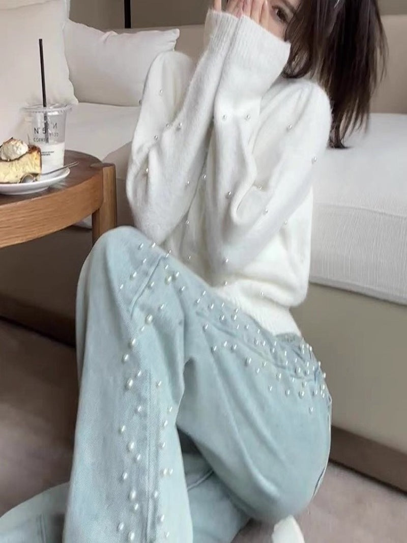 Heavy Industry Beads Vintage Washed High Waist Wide Leg Mopping Jeans