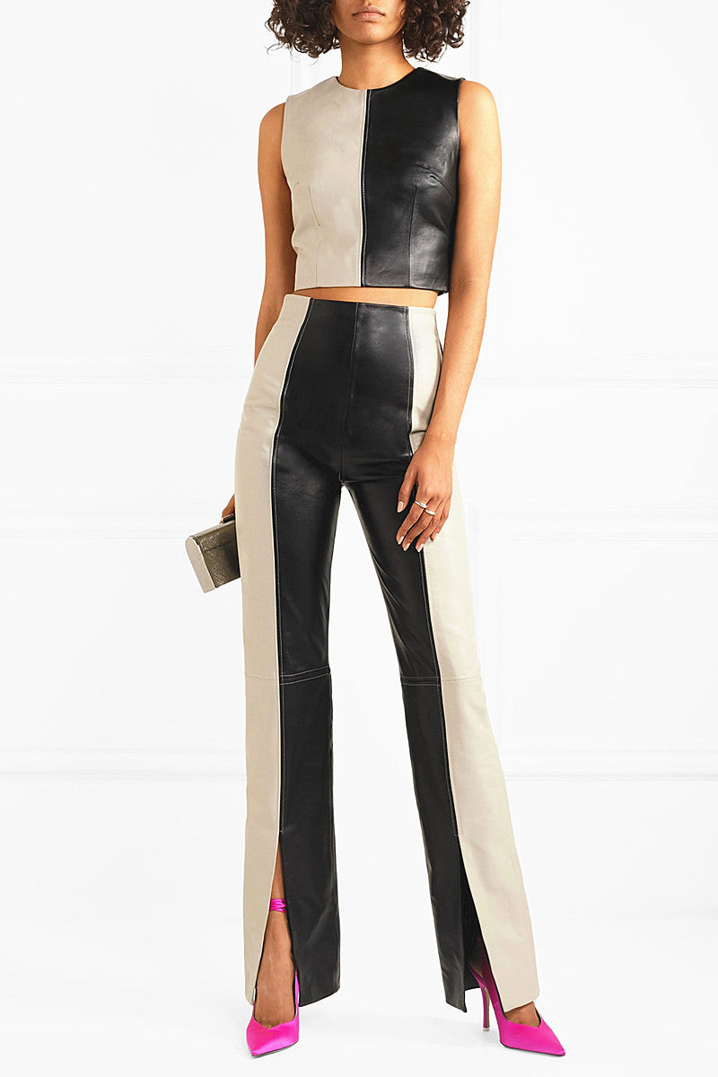 High Waist Slim Two Tone Patchwork PU Leather Pants