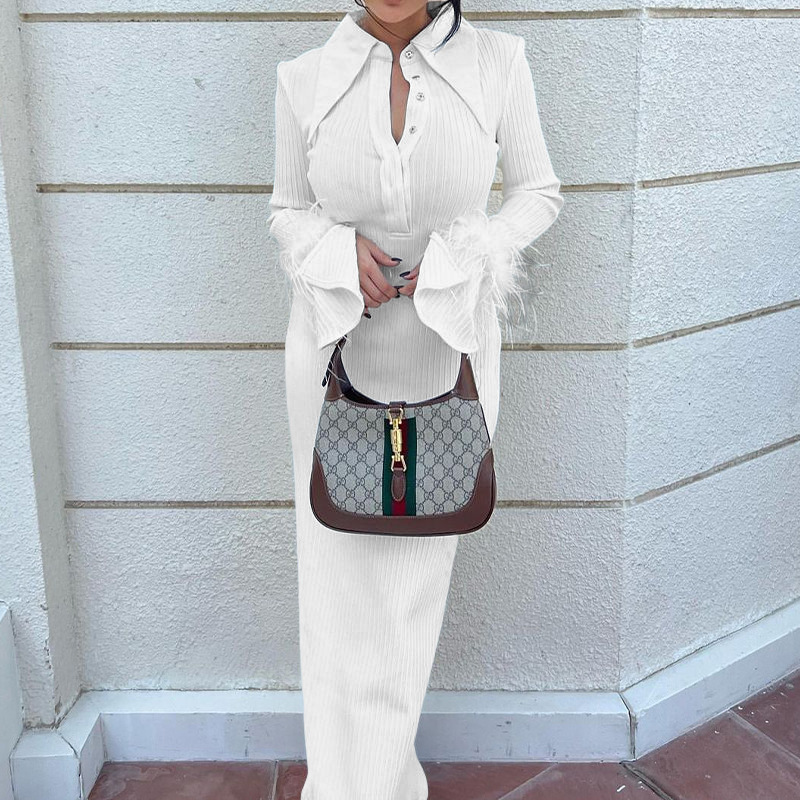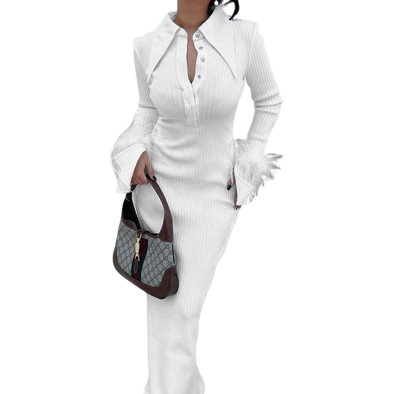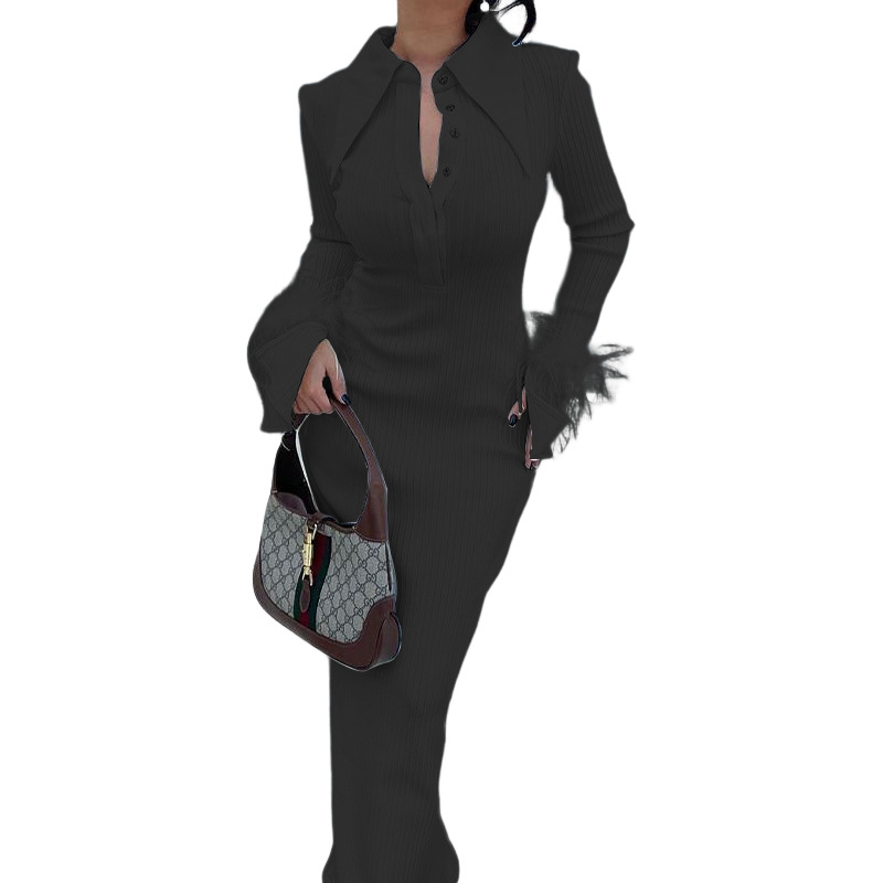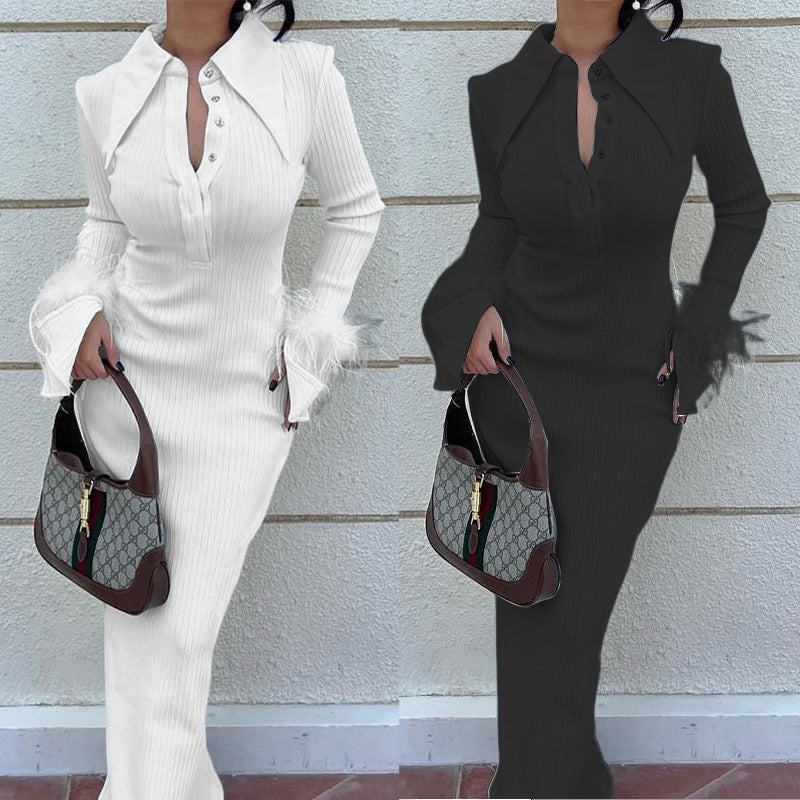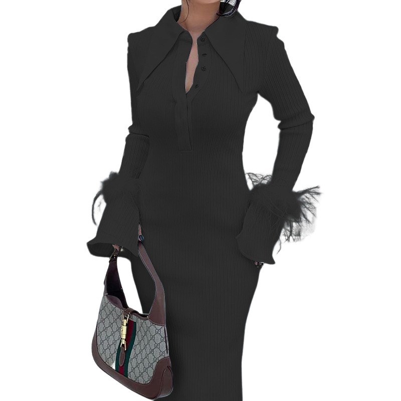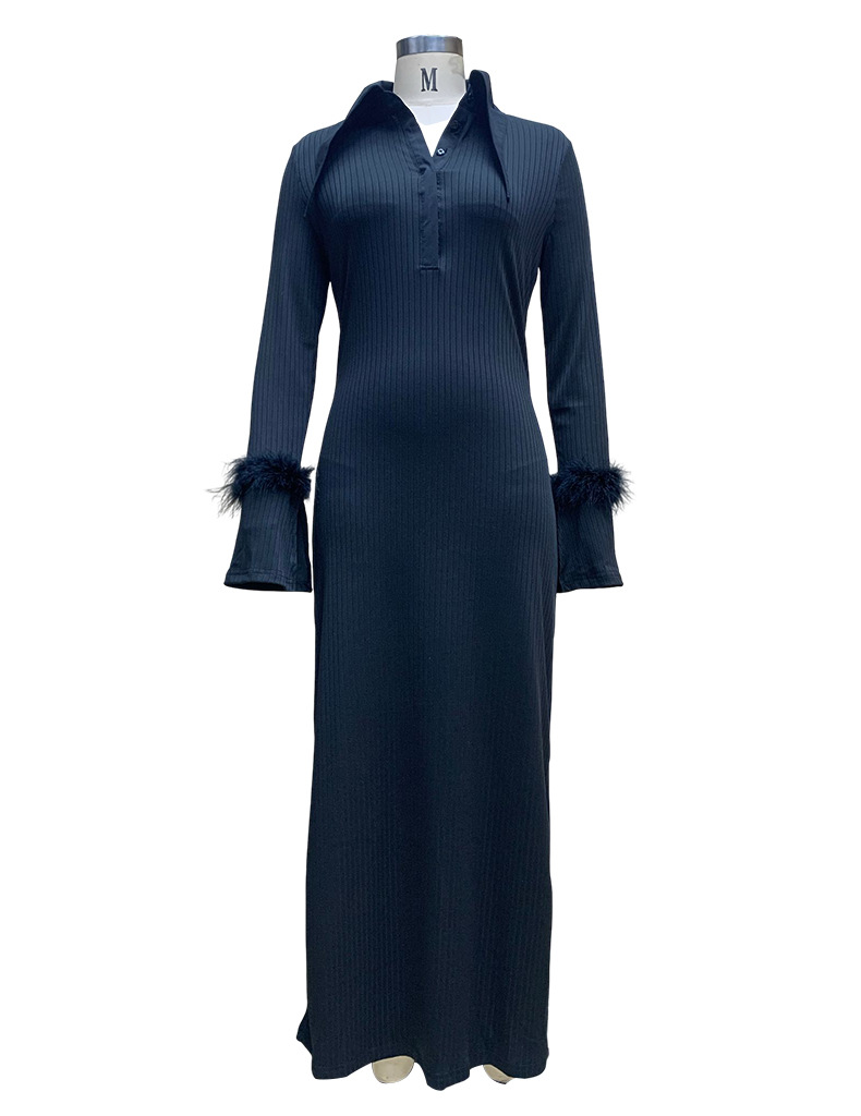Lapel Long Sleeve Feather Mid-length Sunken Stripe Dress
