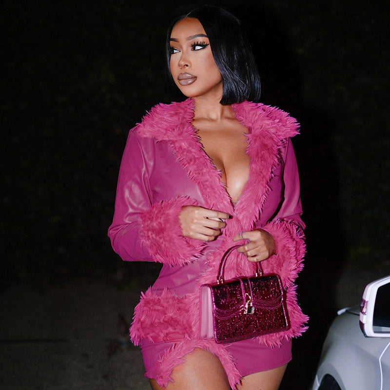 Leather Fur Collar Cardigan Tight Skirt Outfit Women