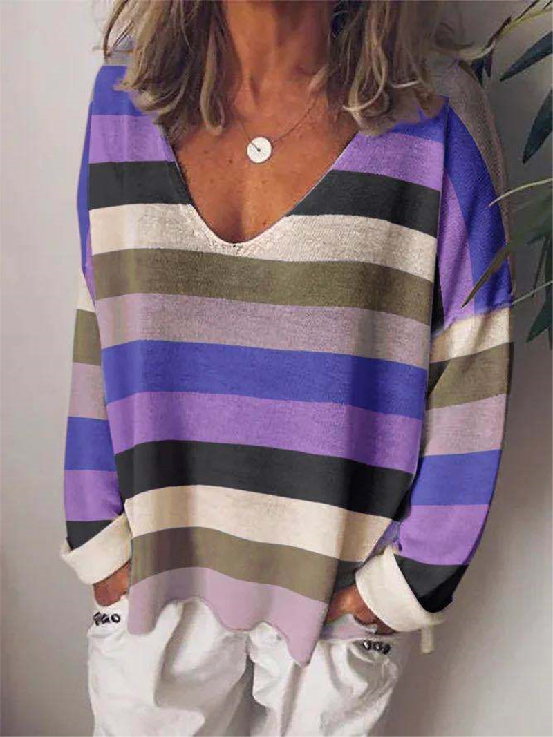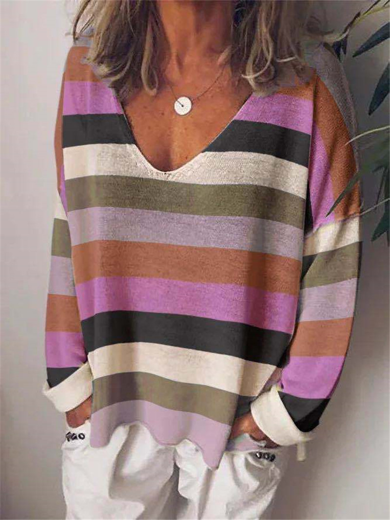 Loose V-neck Rainbow Stripe Multicolor Knit Long Sleeve