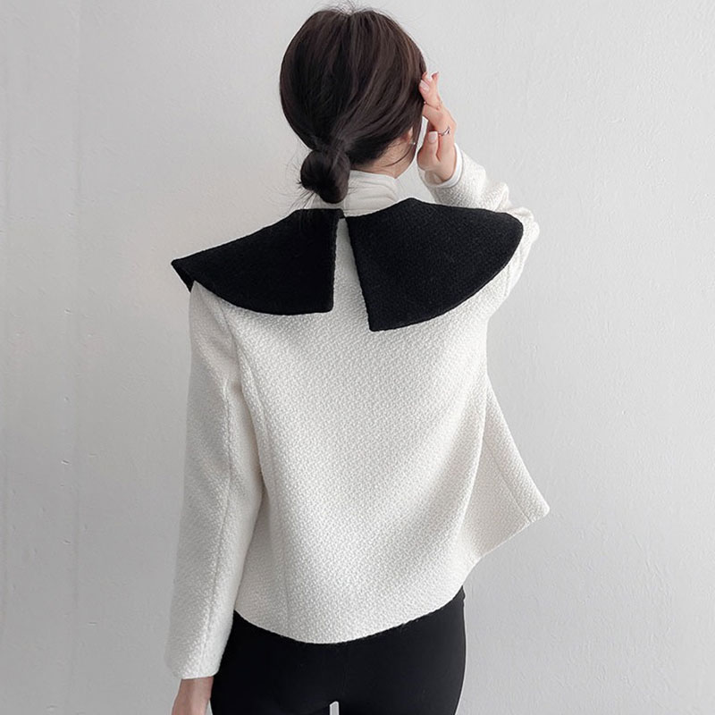 Navy Collar Short Long Sleeve Tweed Coat Top In Contrasting Colors