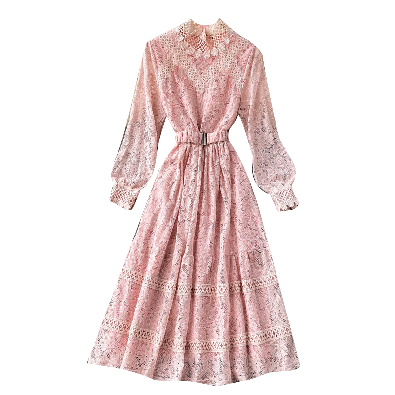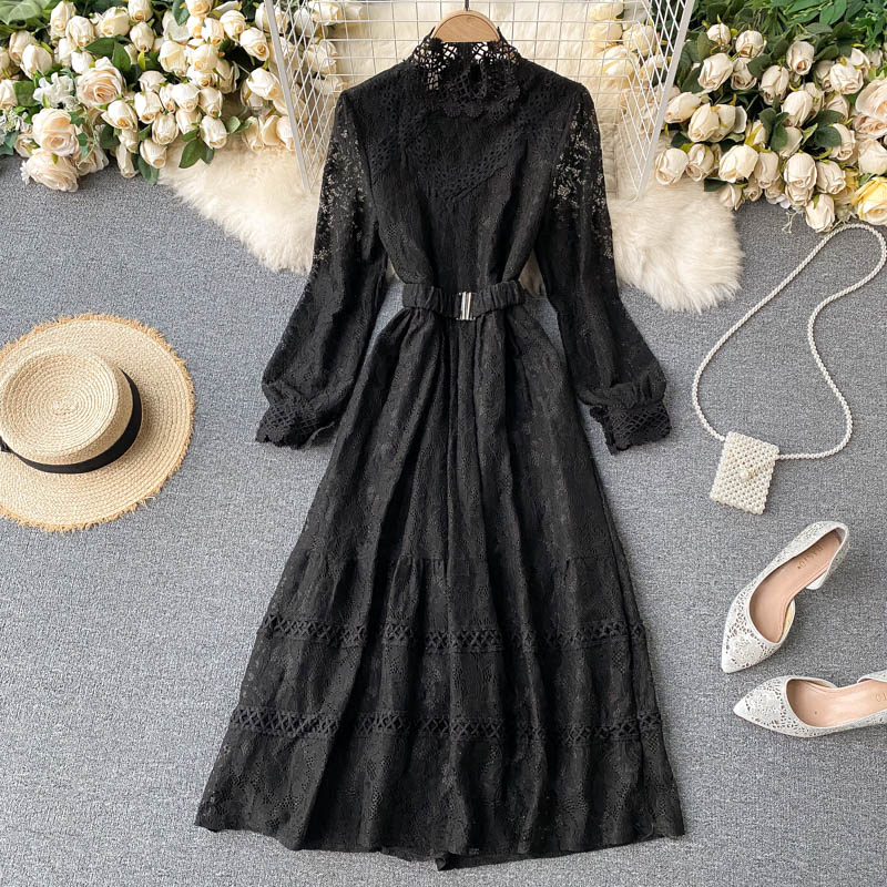 Thin Women’s Elegant New Design Sense Hollow Lace Small Stand-up Collar Slim Mid-length Fairy Dress