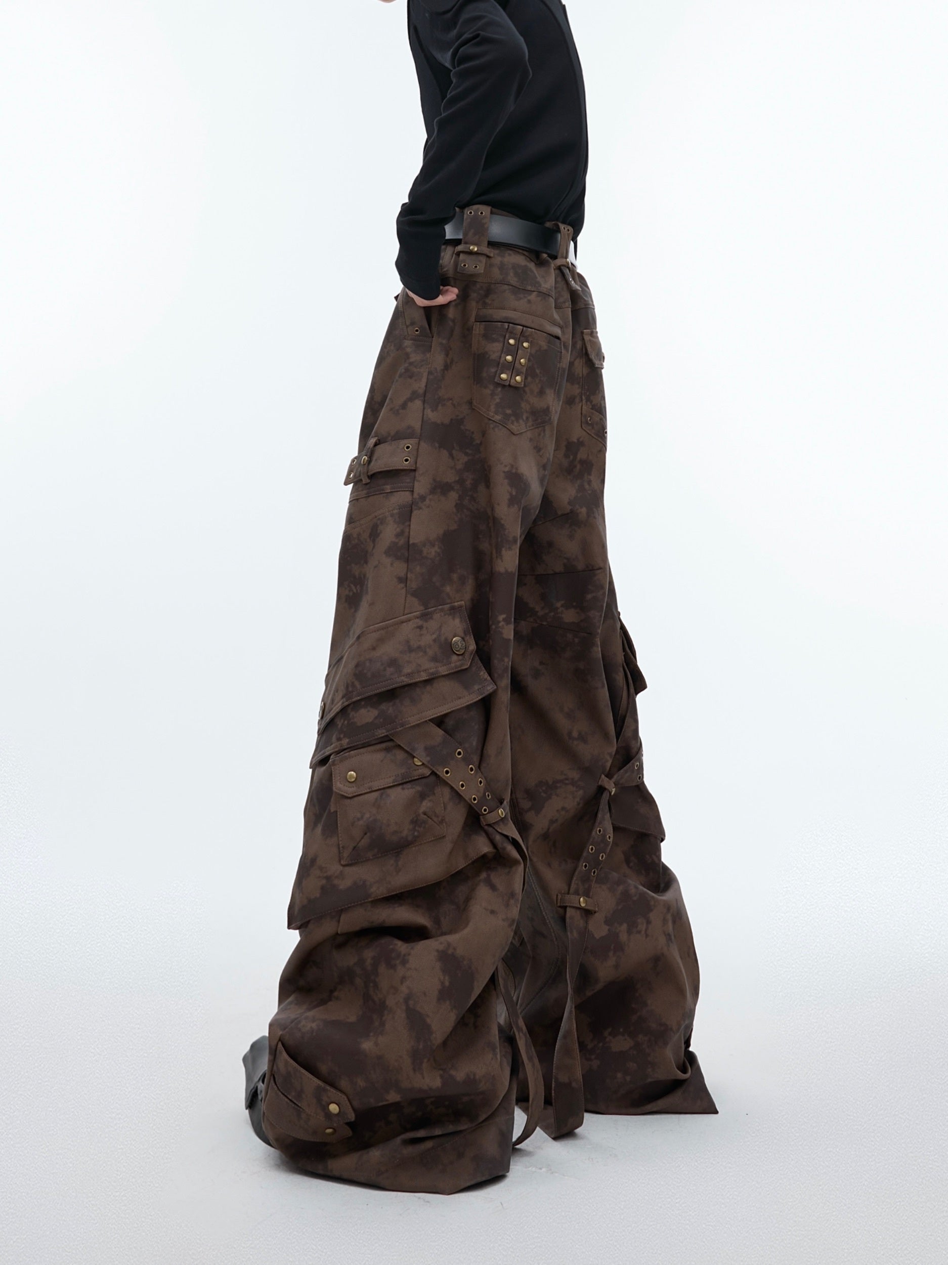 Niche Retro Distressed Blooming Heavy Multi-pocket Workwear Leather Pants
