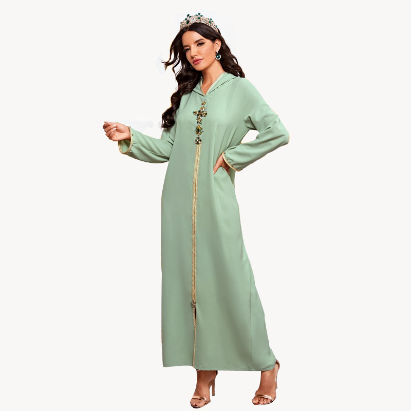 Pure Color Beaded Brick Middle Eastern Robe Dress Hooded Dress