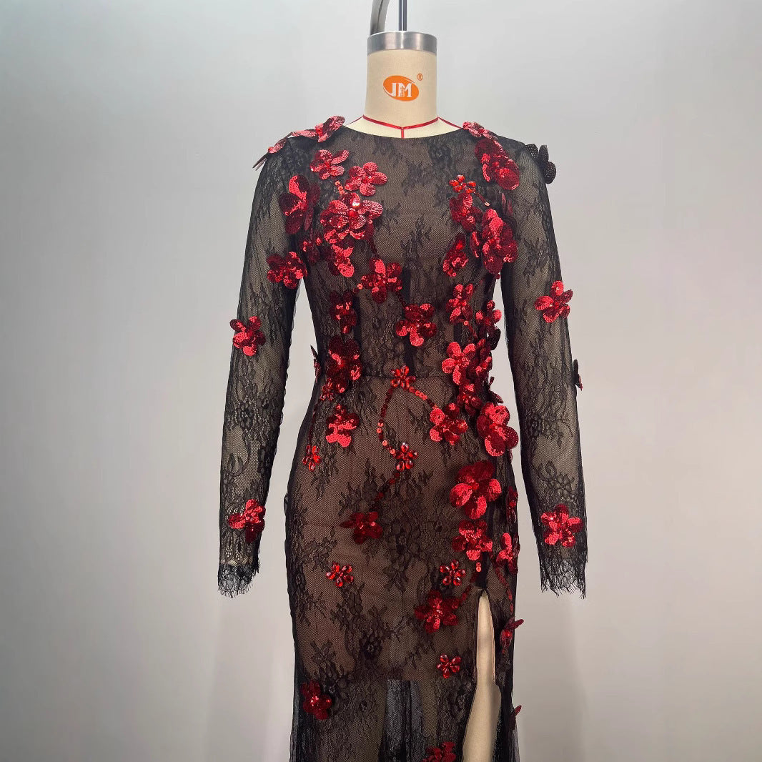 Round Neck Lace See-through Sequined Slit Slim-fitting Birthday Party Evening Dress