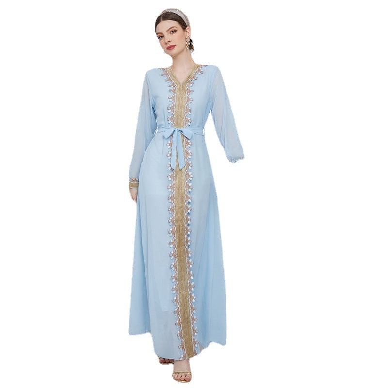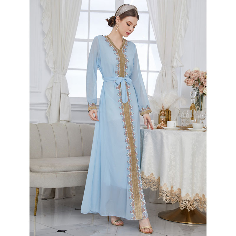 Solid Color Lace Patchwork Receive Waist Chiffon Blue Dress For Women