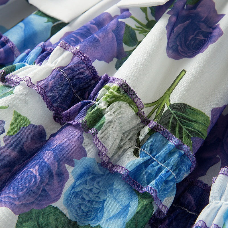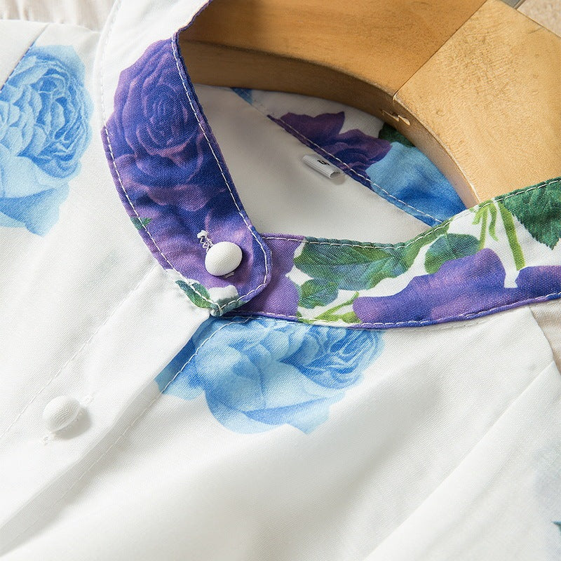 Stand Collar Long Sleeve Floral Print Lace Up Girdle Dress