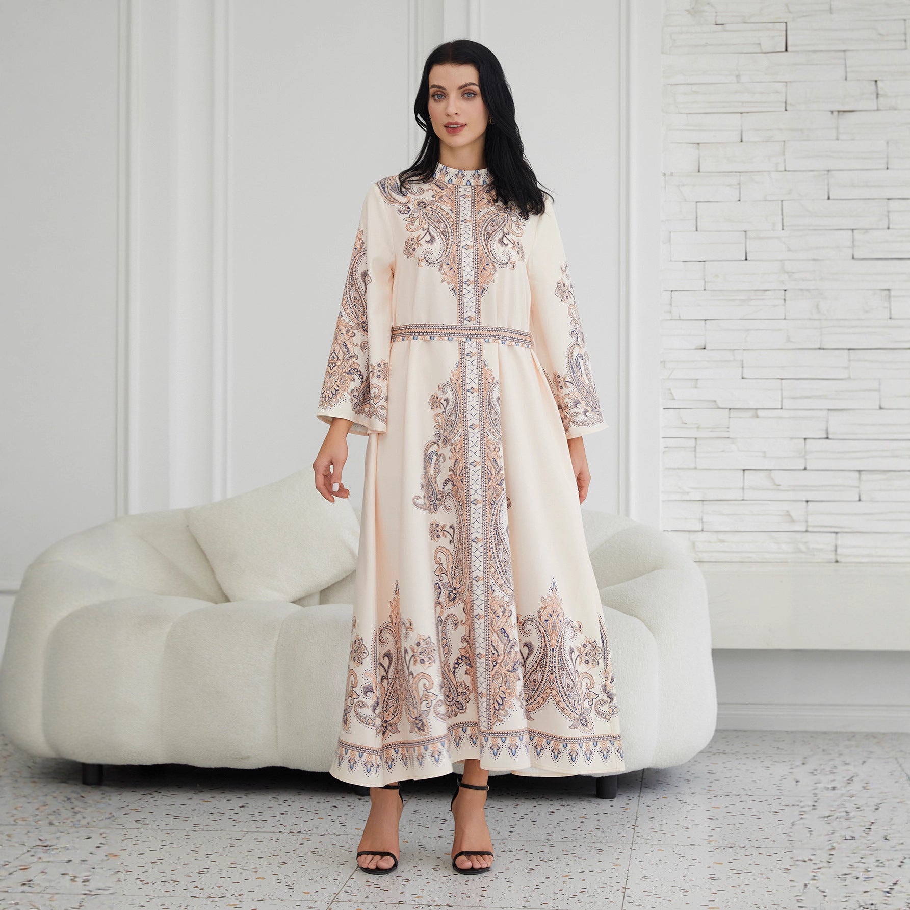 Stand Collar Printing Long Retro Muslim Dress
