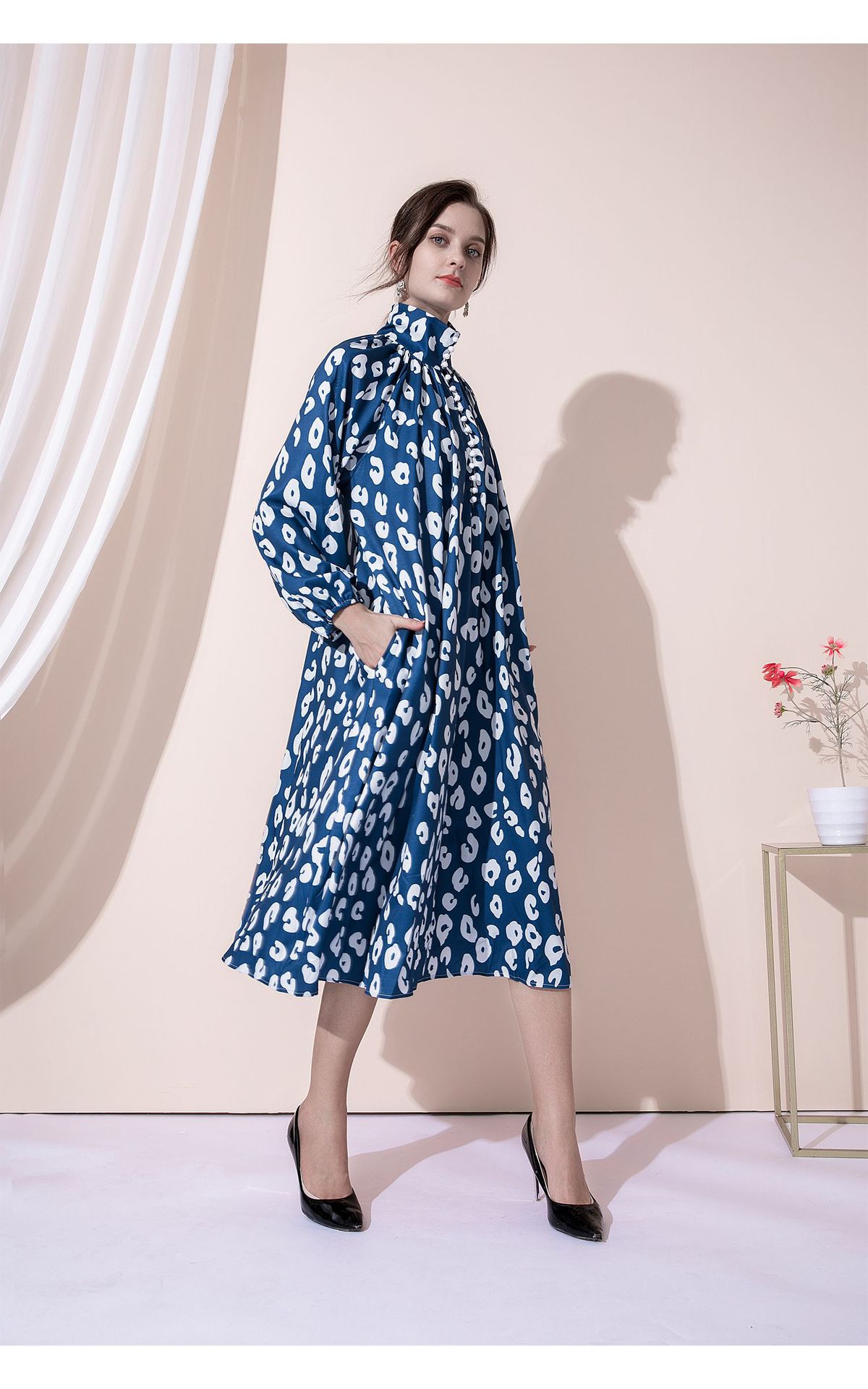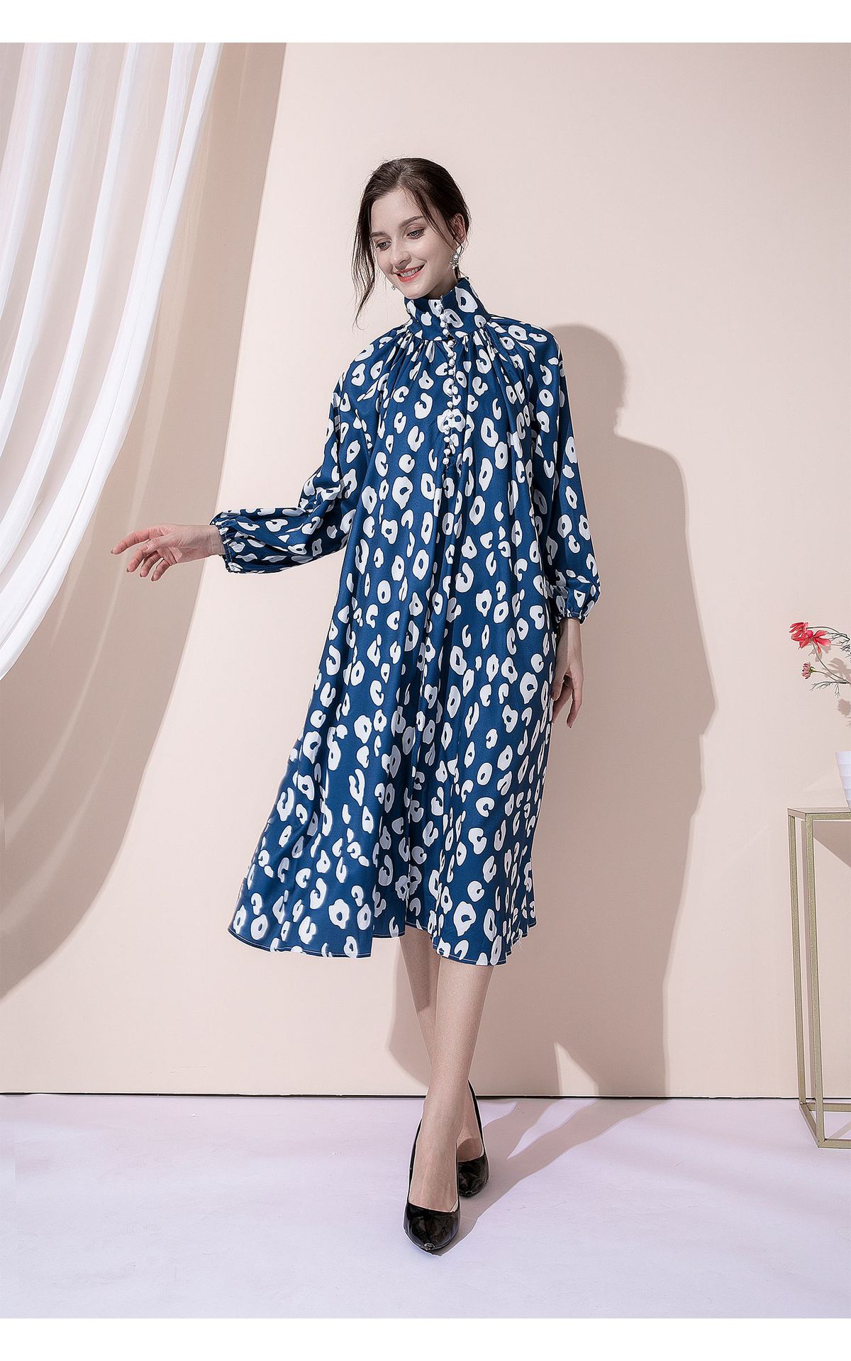 Temperament Stand Collar Buttoned Slim Mid-length Puff Sleeve Printed Dress
