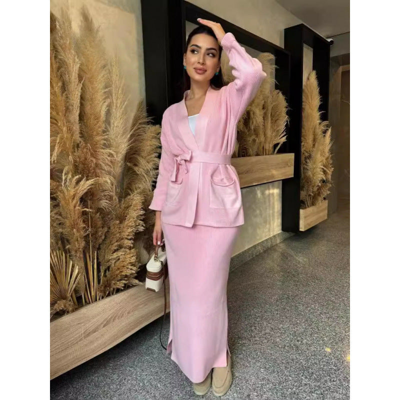 Thermal Knitting Lace-up Long Sleeve Cardigan Long Skirt Two-piece Sweater