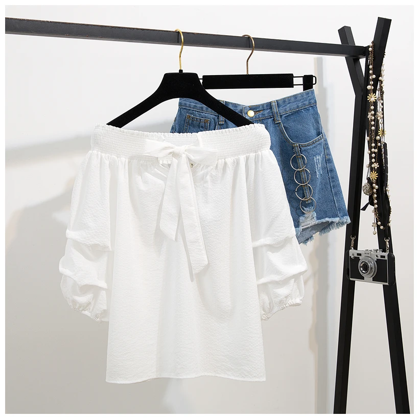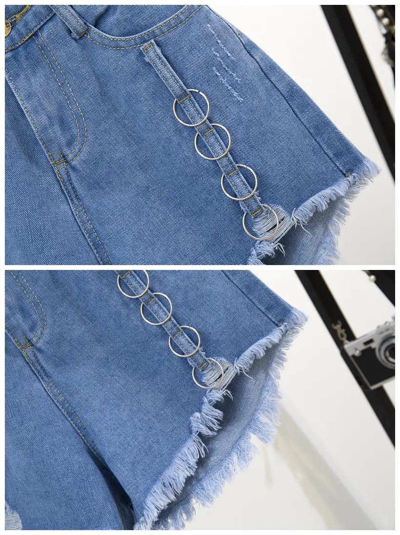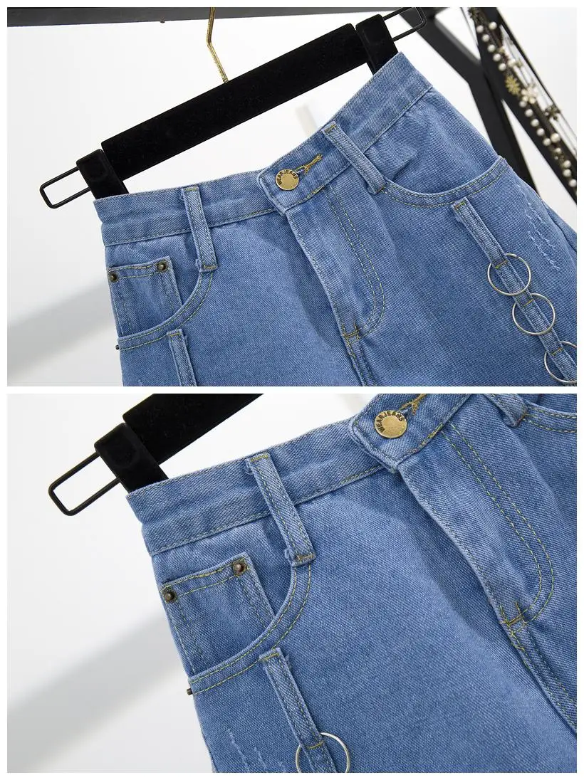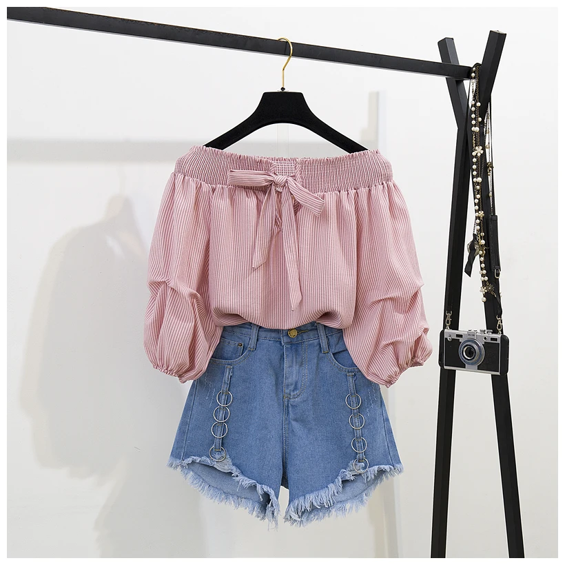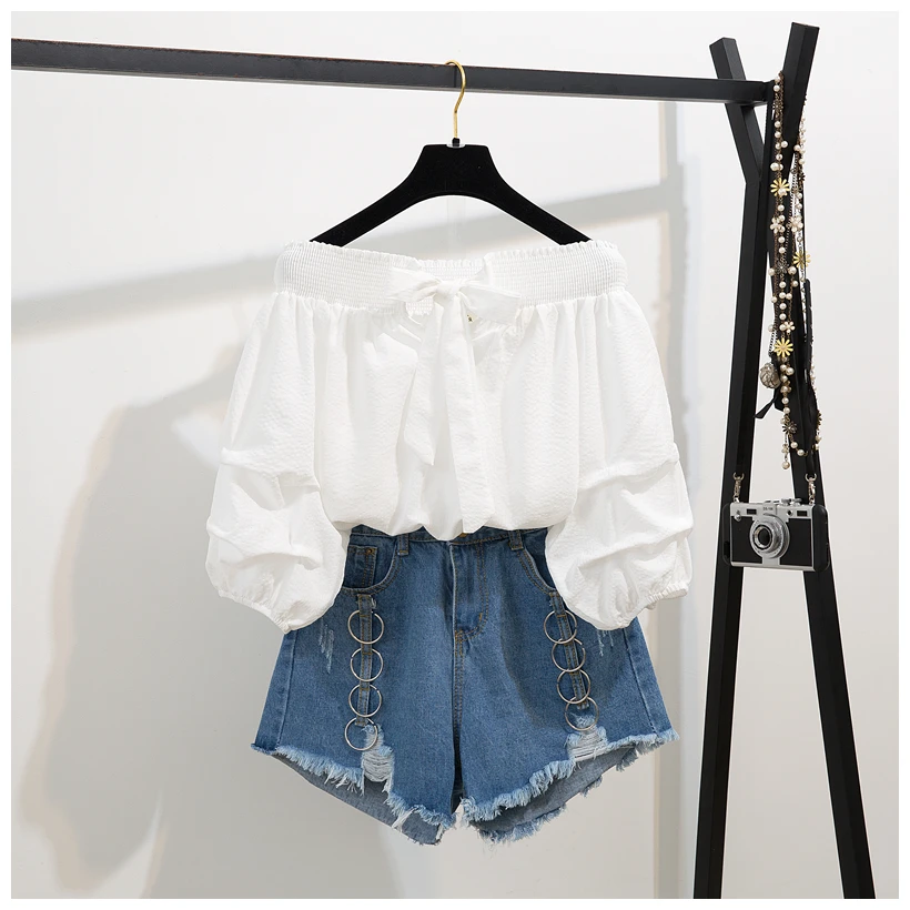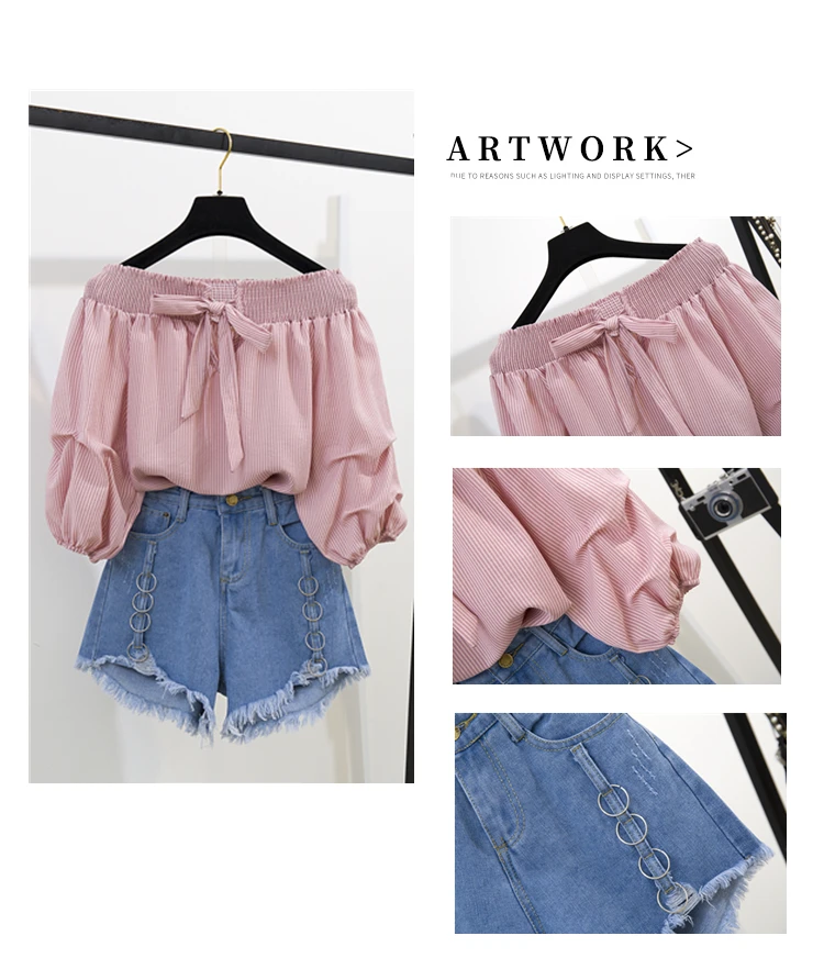 Two-piece suit with high neck denim shorts
