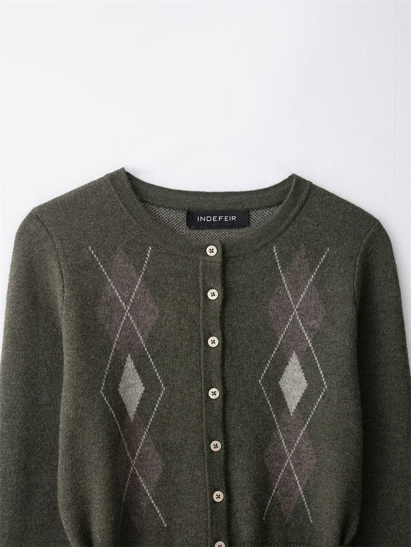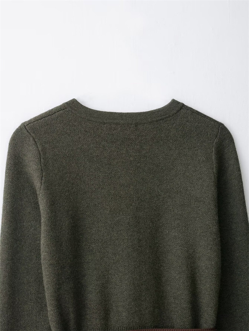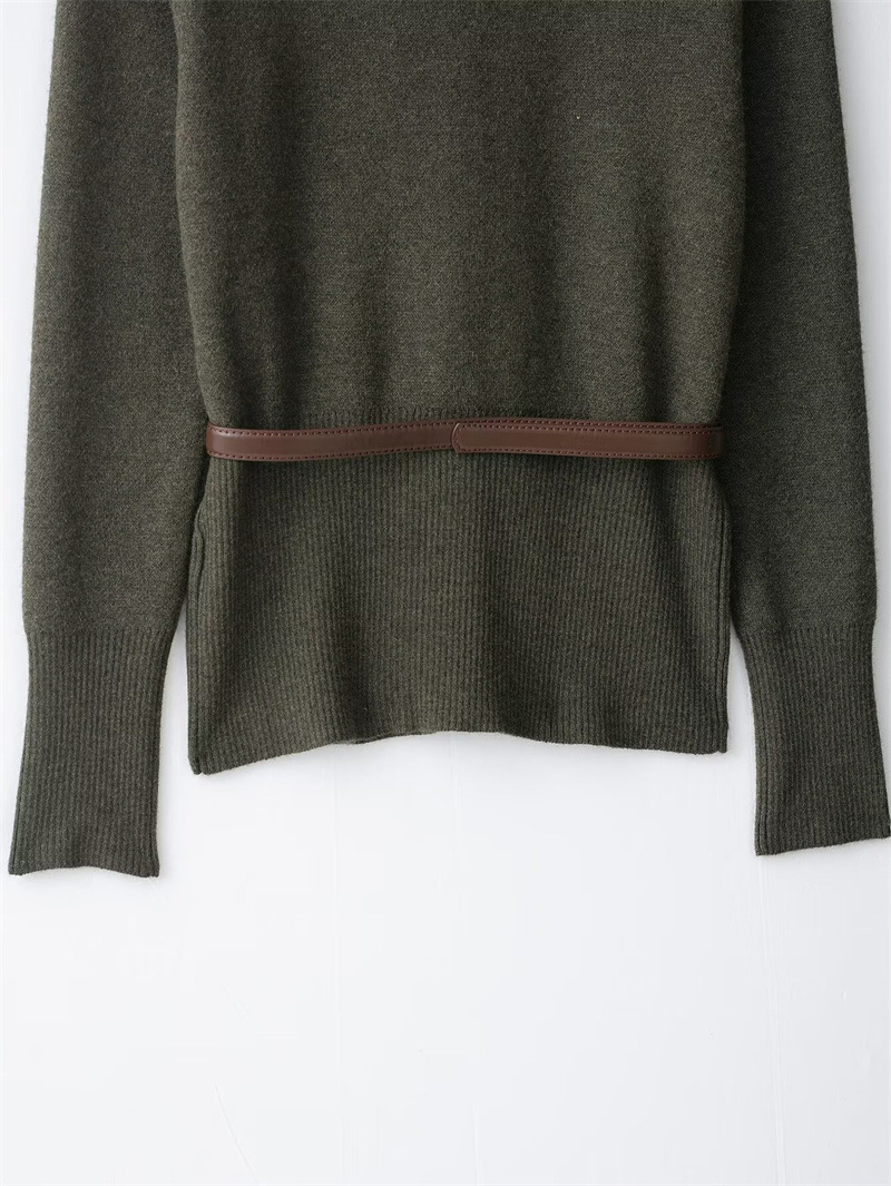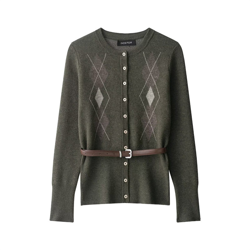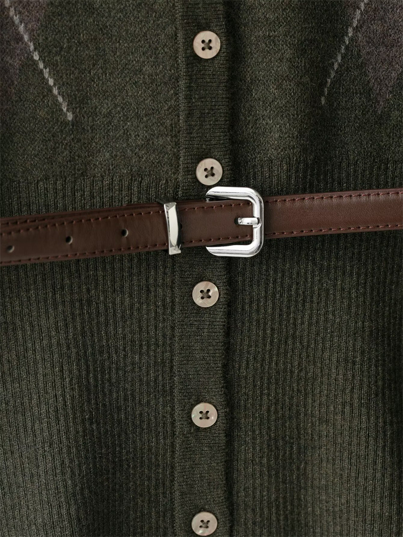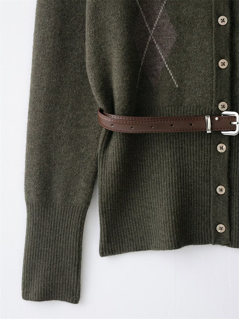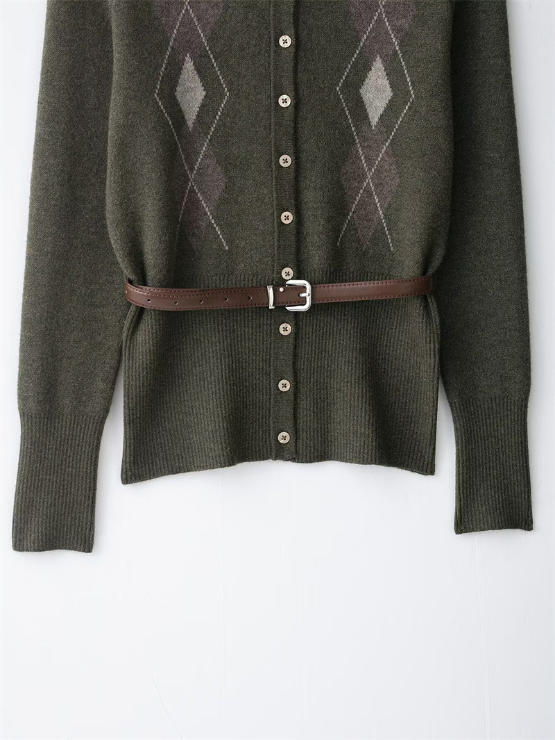 With Belt Diamond Pattern Knitted Coat Midi Skirt Suit
