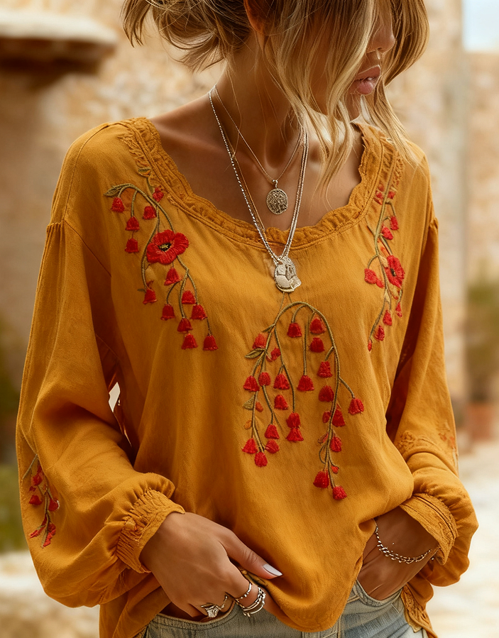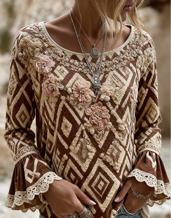 Women's Bohemian Style V-Neck Long Sleeve Shirt - Loose Printed Top