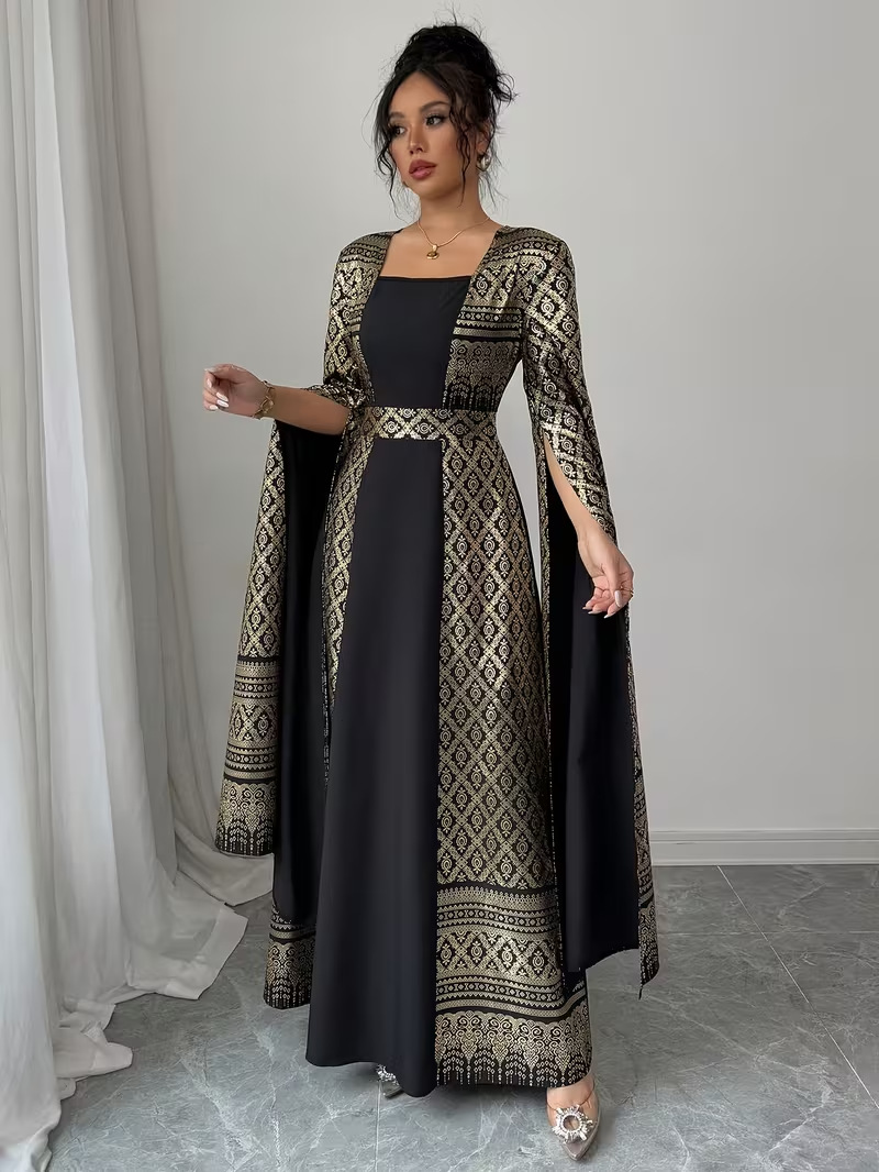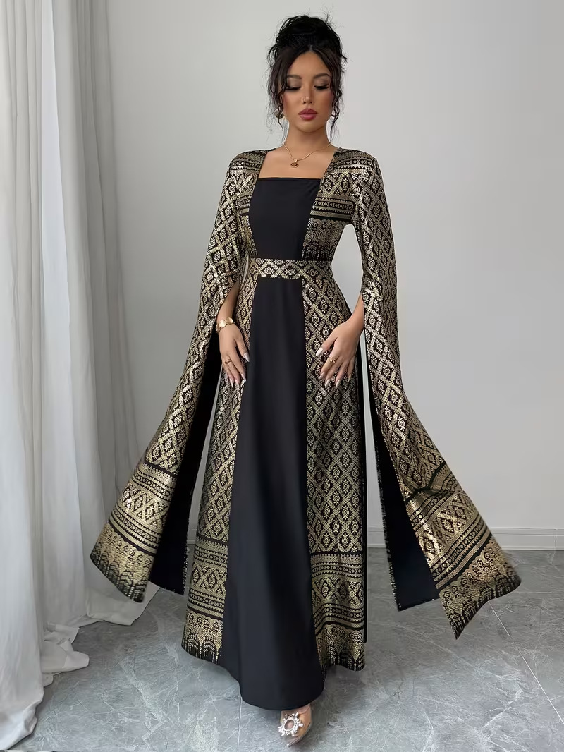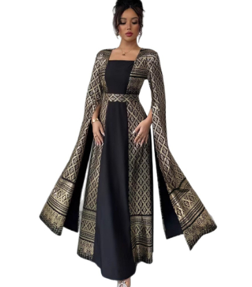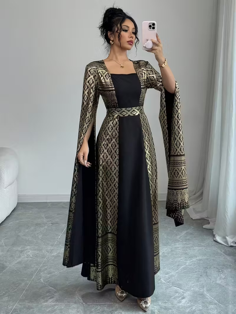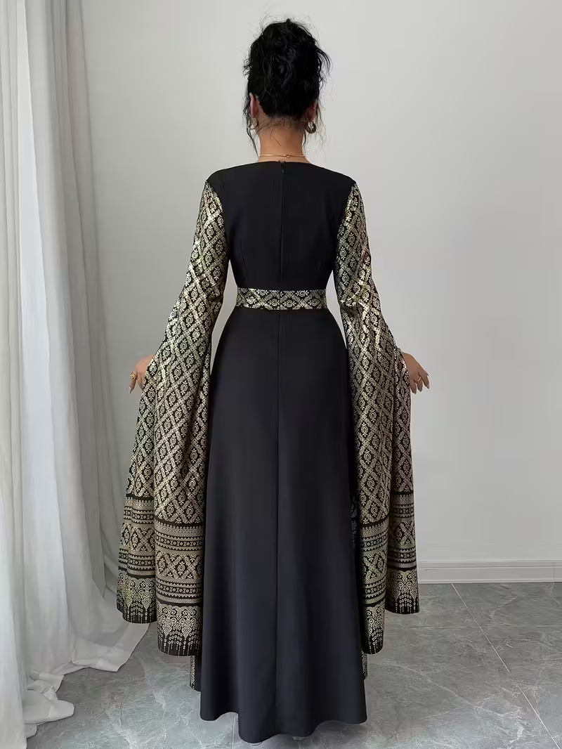 Elegant Arabian Womens Casual Long-sleeve Flared Dress