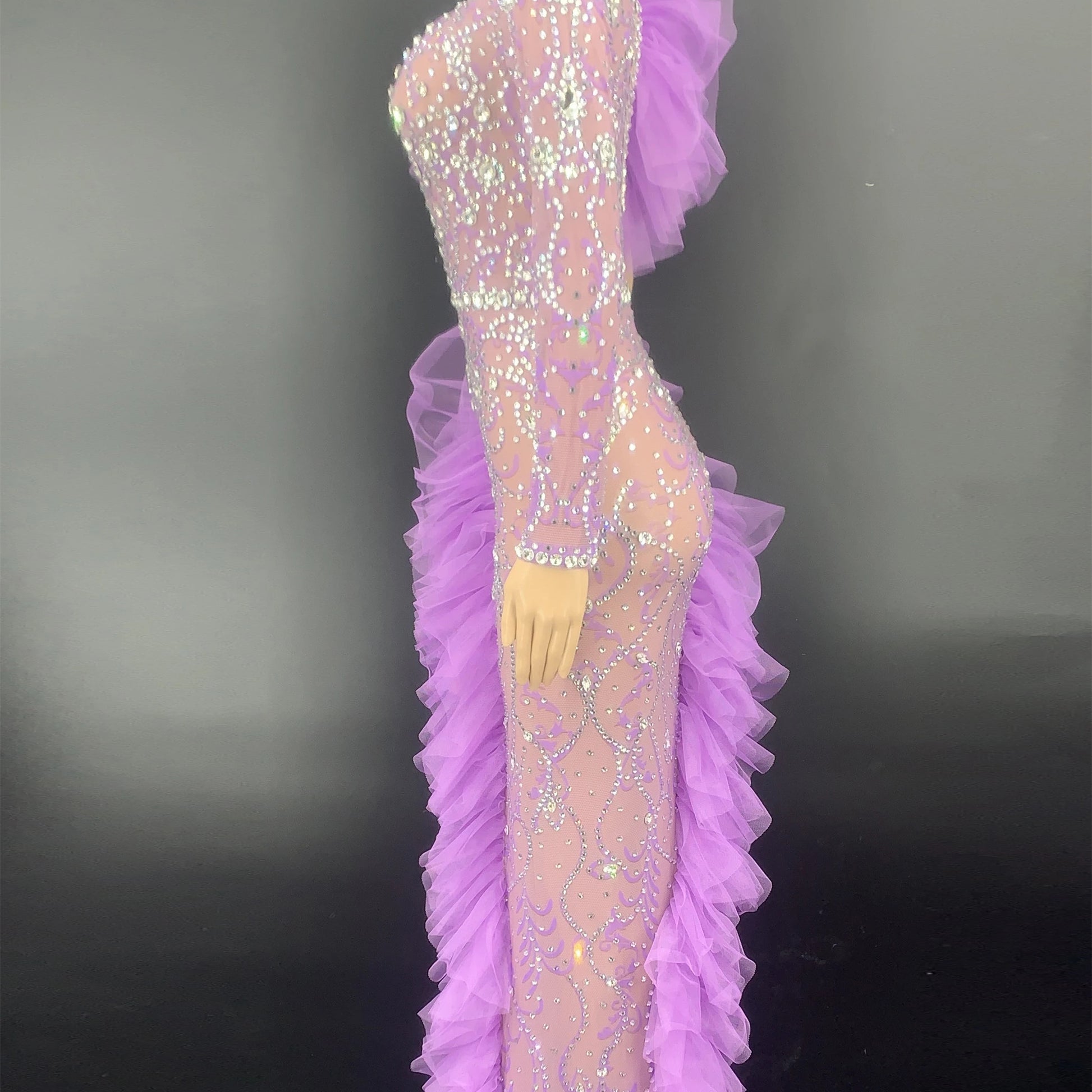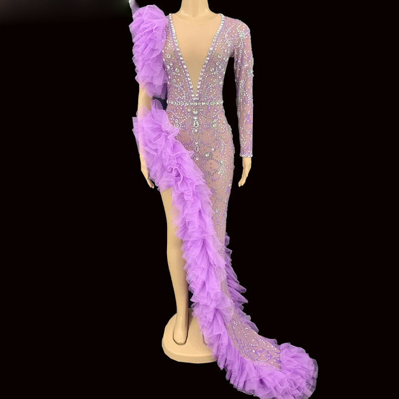 Women's Diamond Slit Single Sleeve Pleated Tulle Dress