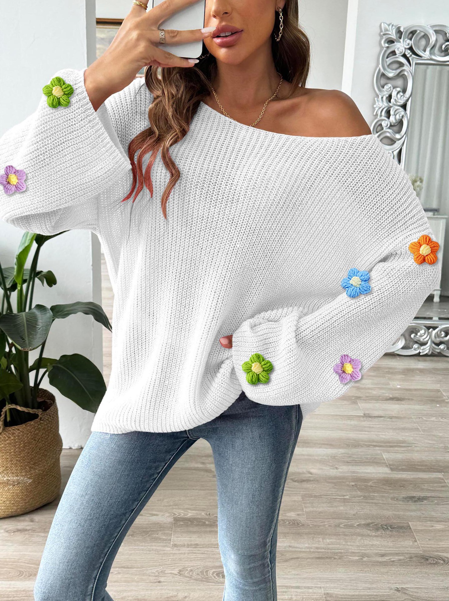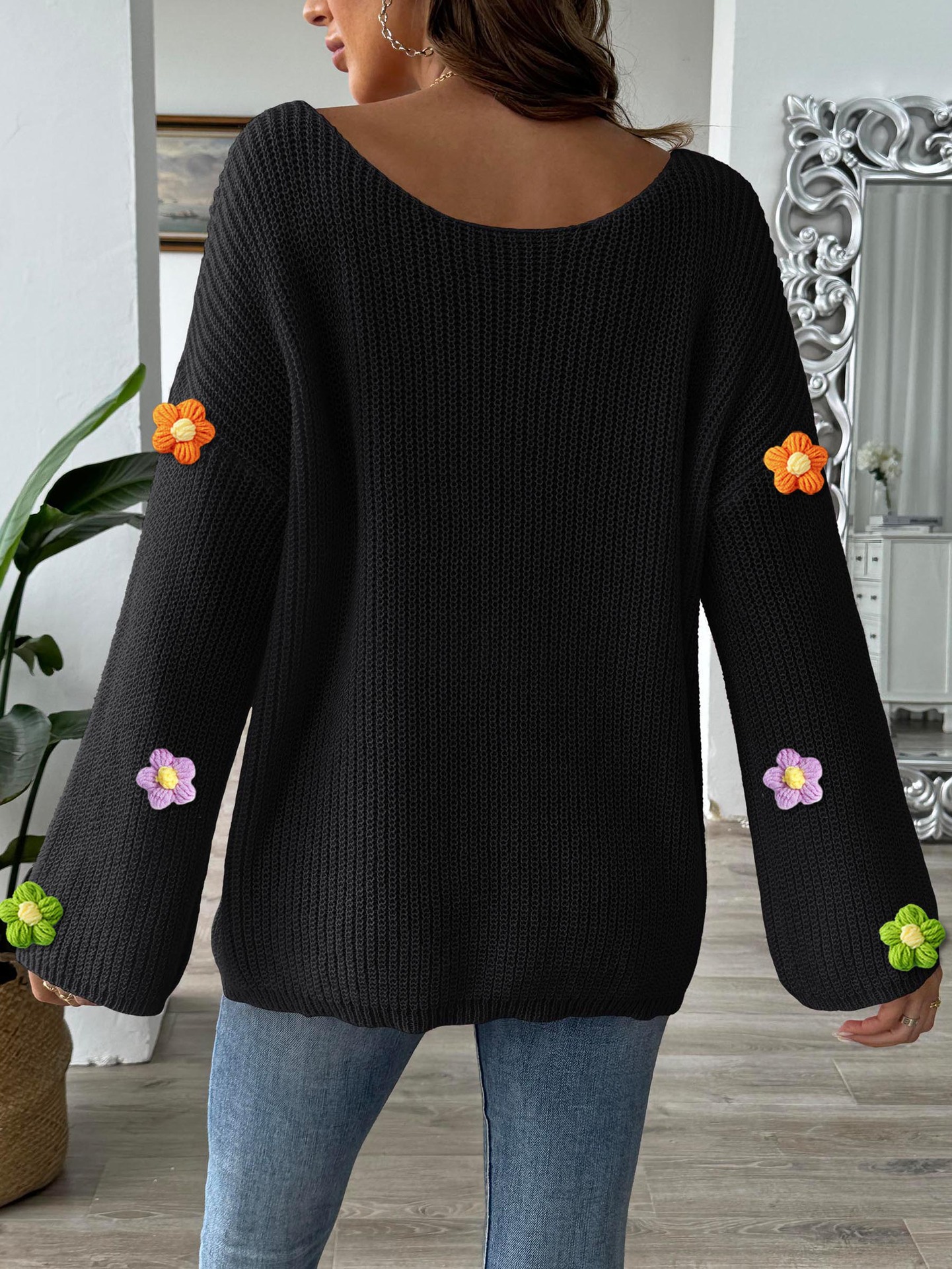 Womens Hand-Crocheted Floral Patchwork Flare-Sleeve Sweater