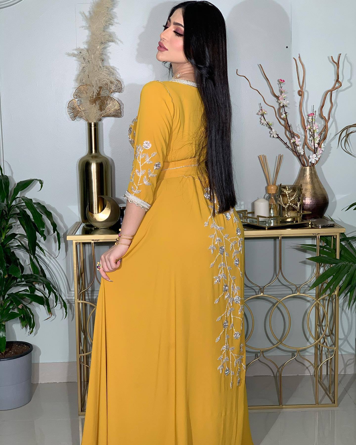 Women's Middle East Hot Fix Rhinestone Kraft Tan Robe Gown