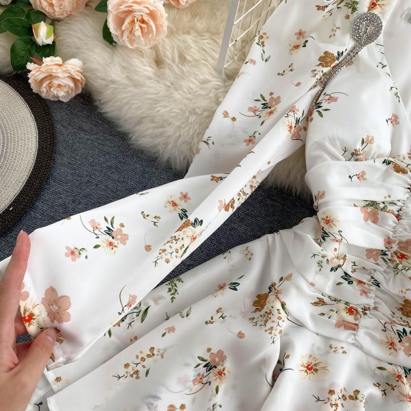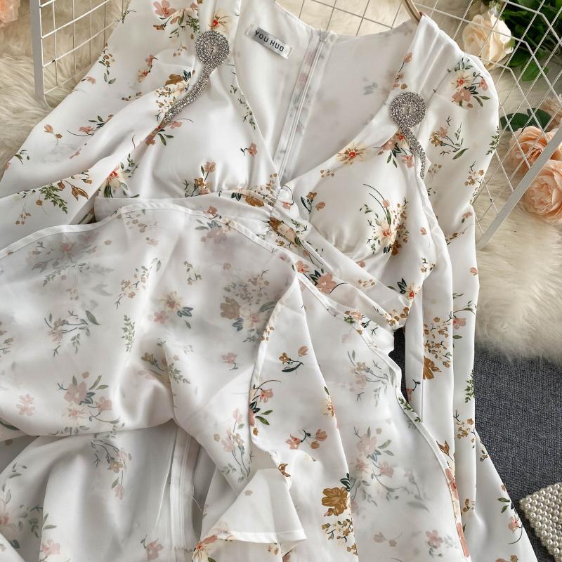 Women's Retro Pleated Waist Slimming Long-sleeved Floral Skirt
