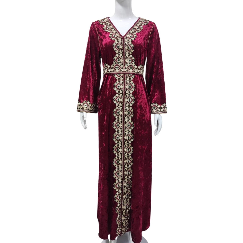 Arab Women's Slim V-neck Long Sleeve Embroidery Pleuche Dress
